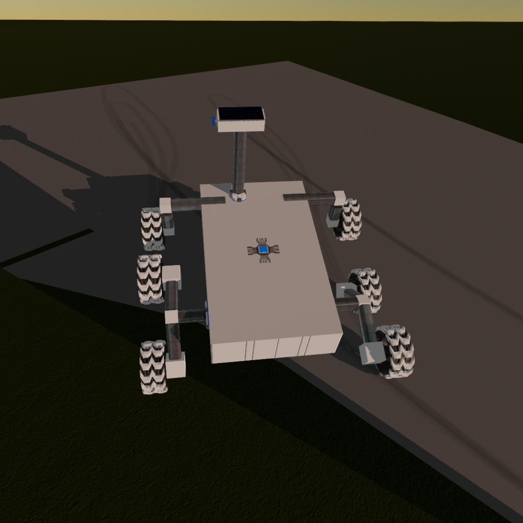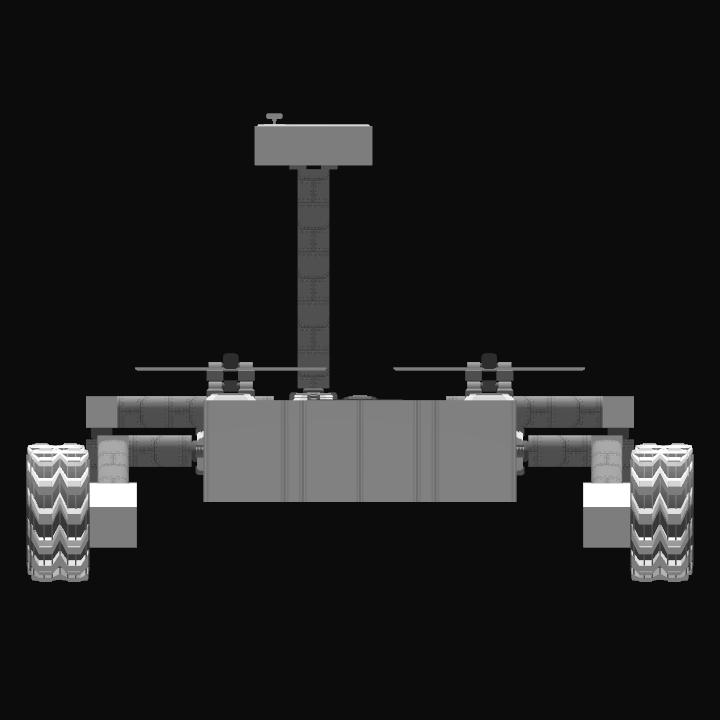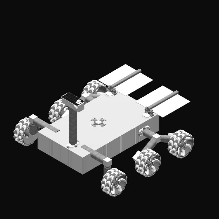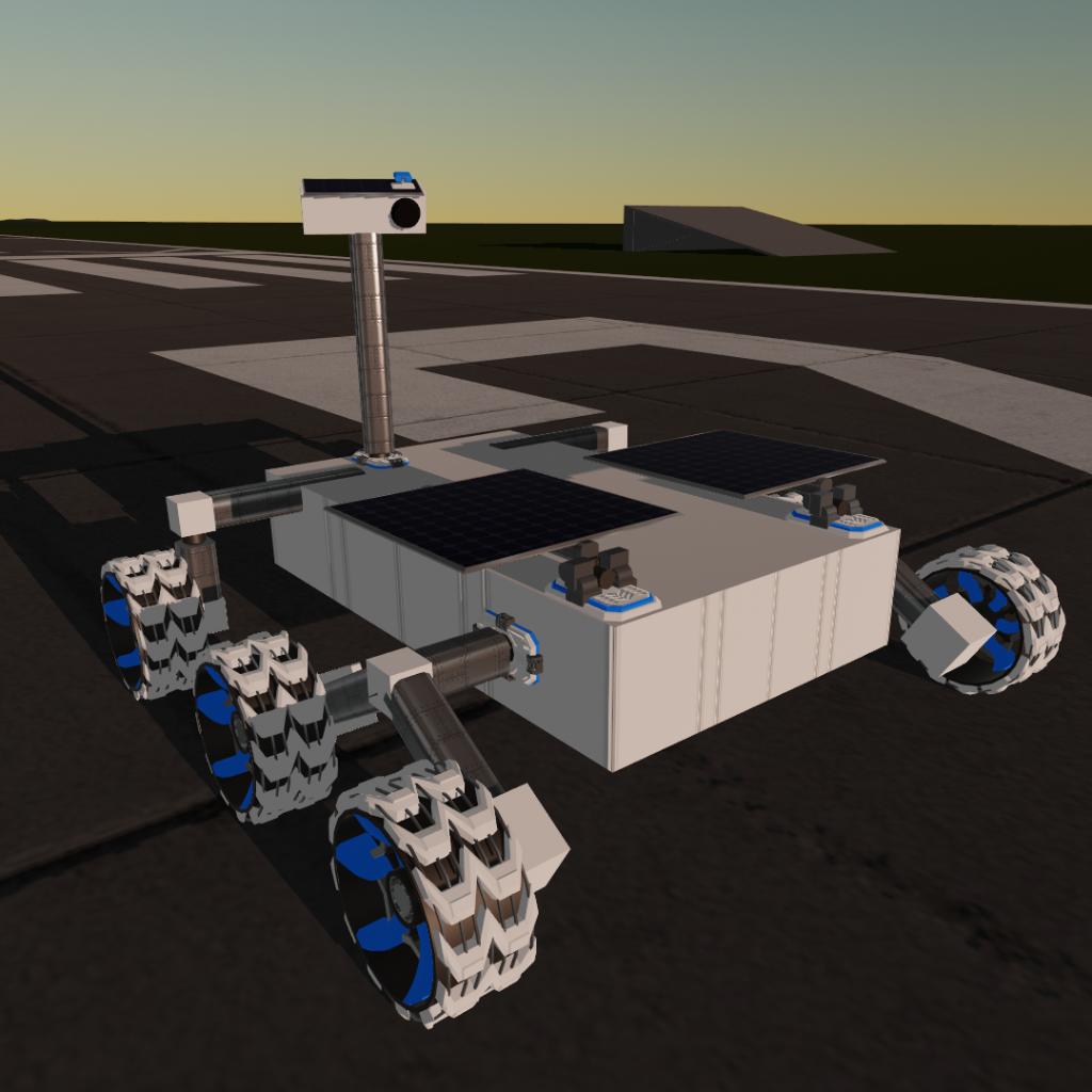 This is Interstellar's protoypye design for a rover, it featurse a rocker-buggy suspension system, and a rotating camera mast. It is entirely solar powered.