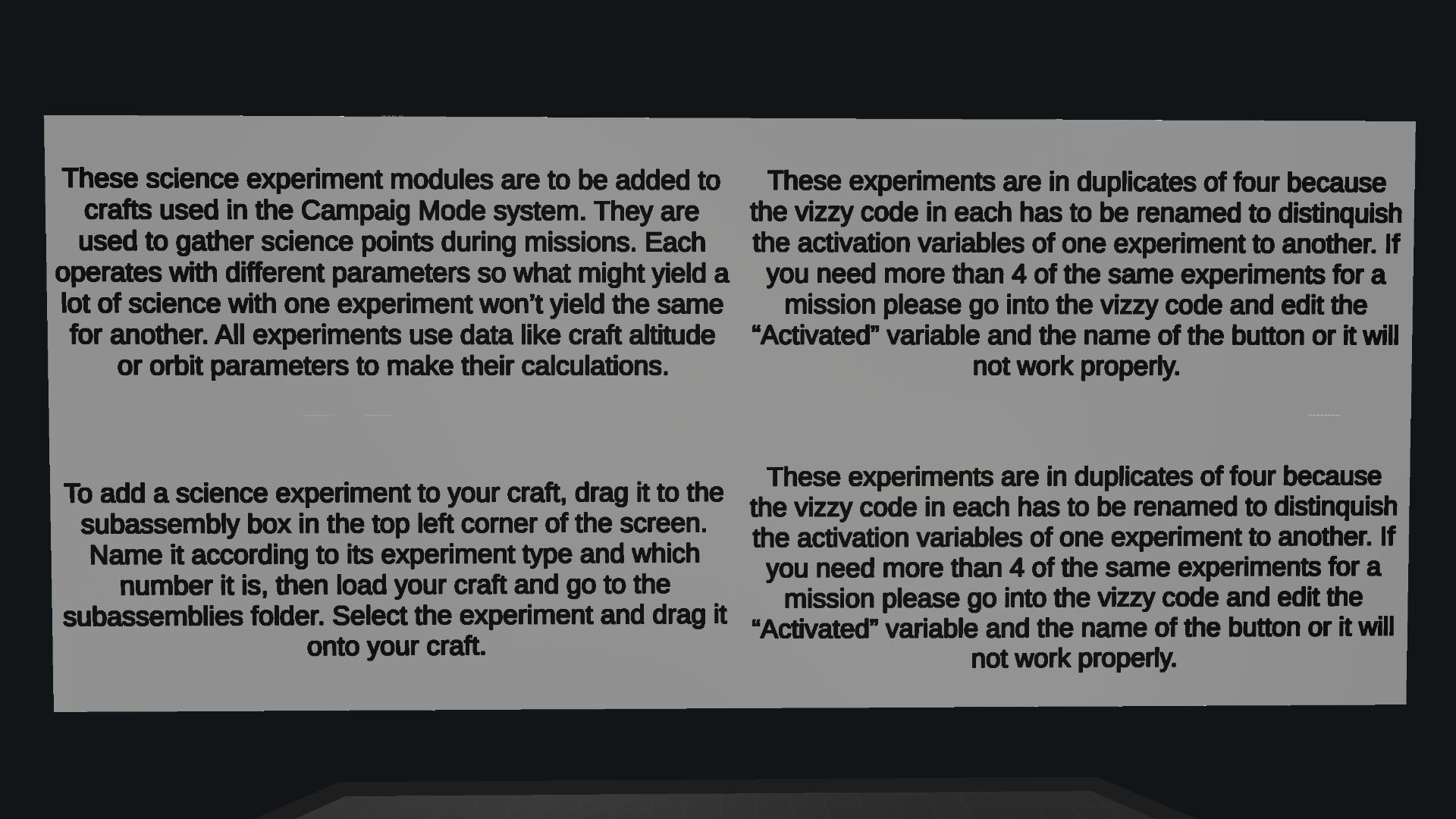 These part are to be used with the Campaign Mode program. They allow users to gather science points on their missions to unlock new technologies