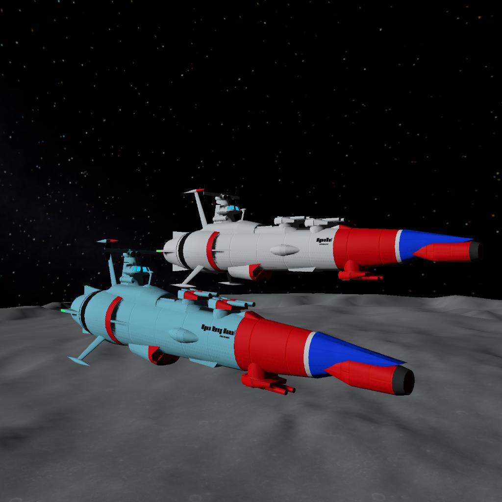 The patrol ship is characterized by its cylindrical hull shape. It is said that German design and the metric system were used. The artillery includes a small Wave-Motion Gun in the bow, a positron turret (known as the MK.12 twin 127mm guns), and two triple torpedo tubes (MK. 32, 324mm) on each side of the front of the hull. In addition, behind the lower twin turret is the departure and landing port of carrier-based aircraft (presumed to be a Cosmo Seagull).