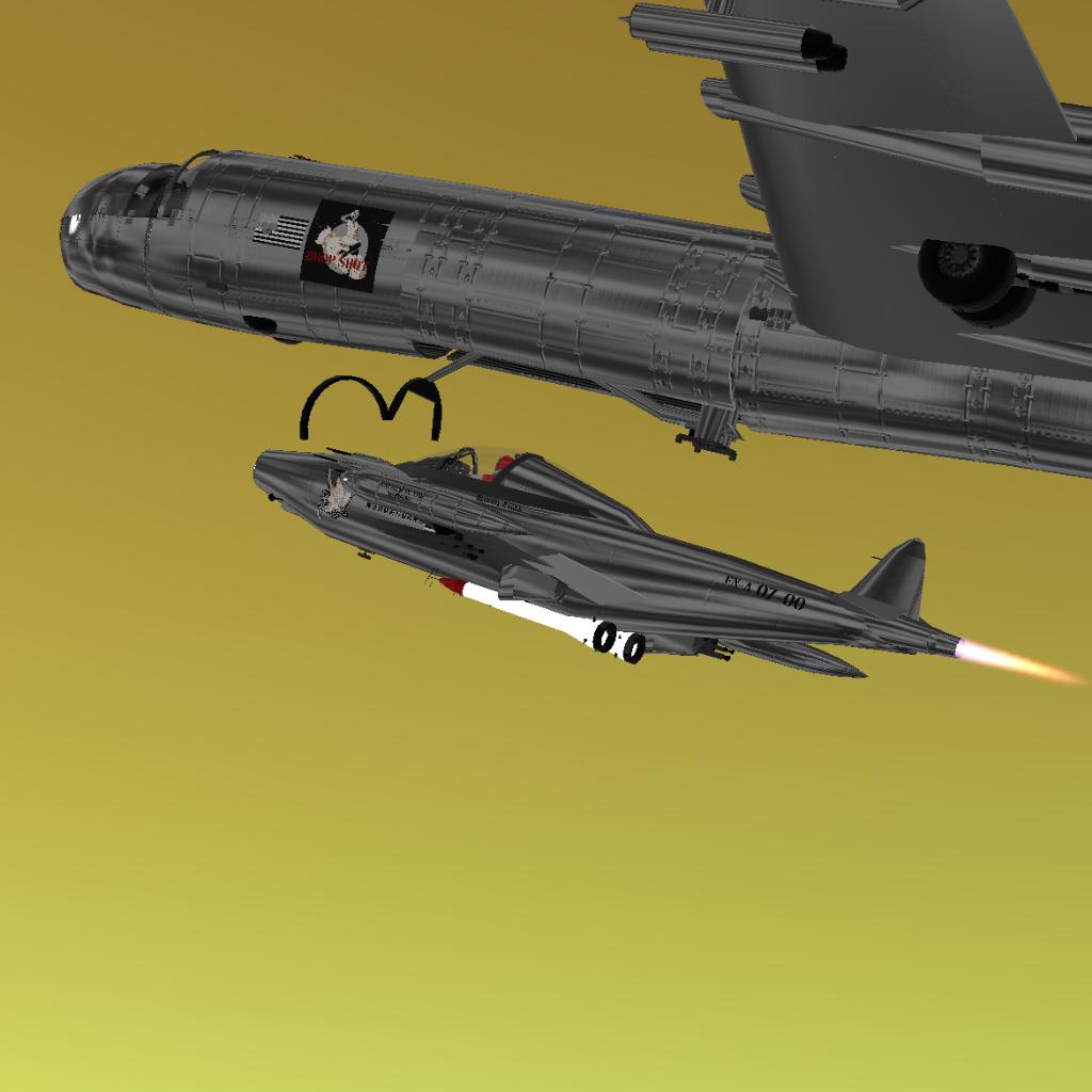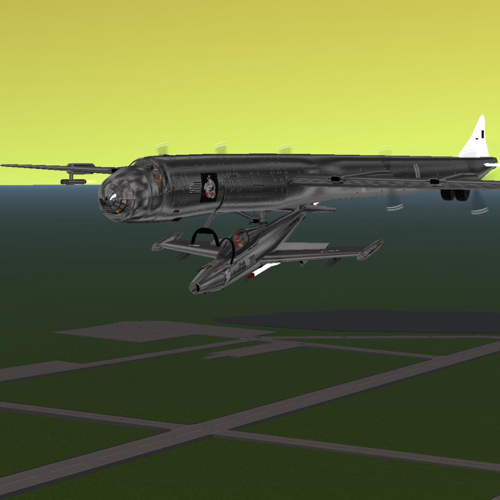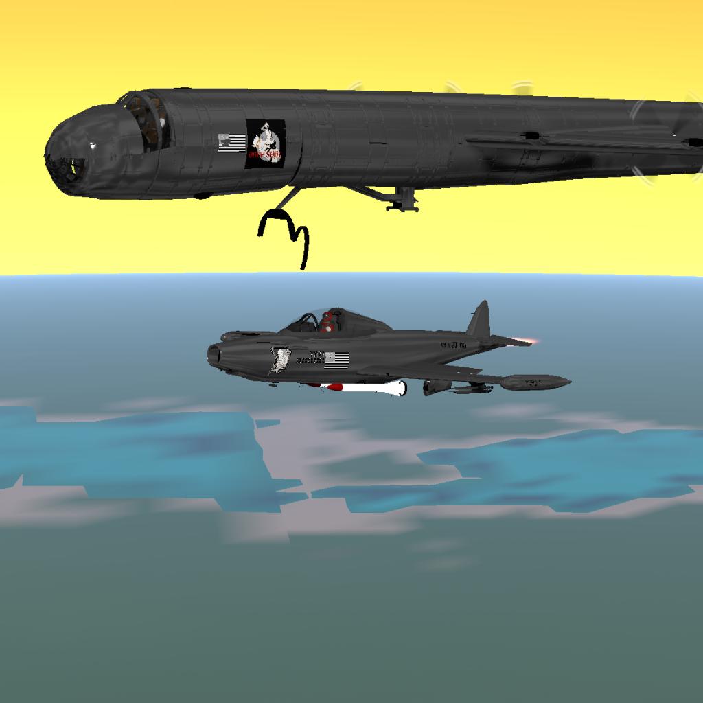 Equipped with Full cockpit, Bomb Bay, FICON RF-84K system, six 28-cylinder radial engines, four J47-19 Jet engines ( Six turnin,Four Burnin! ) defense turrets, Four hydrogen bombs, 46 Cluster bombs, and rockets on the F-84.