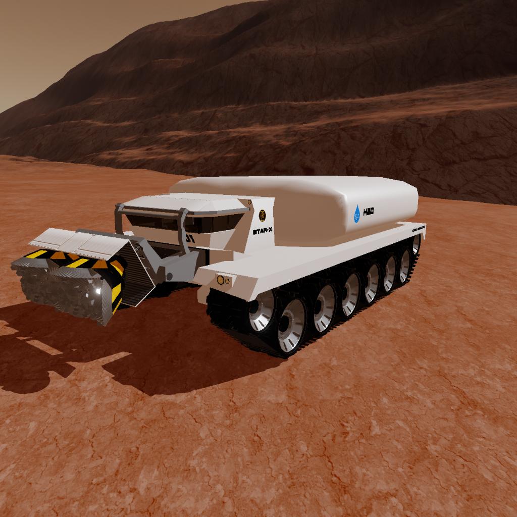 Miner is a tracked vehicle that drills out surface/subsurface rock/regolith/ice to produce water. The refinery will use the water to produce Hydrogen and Oxygen to be further refined into various fuels.