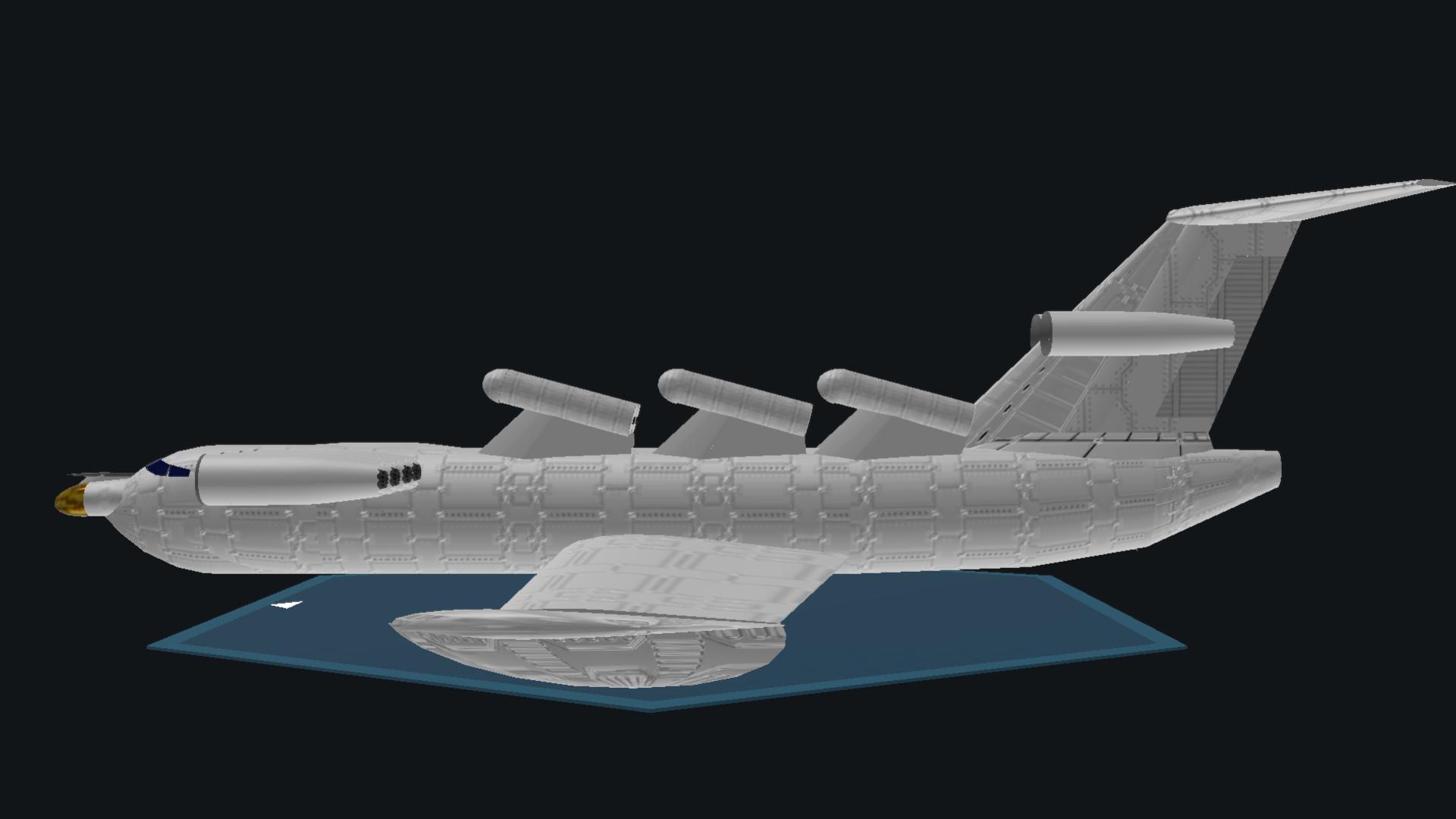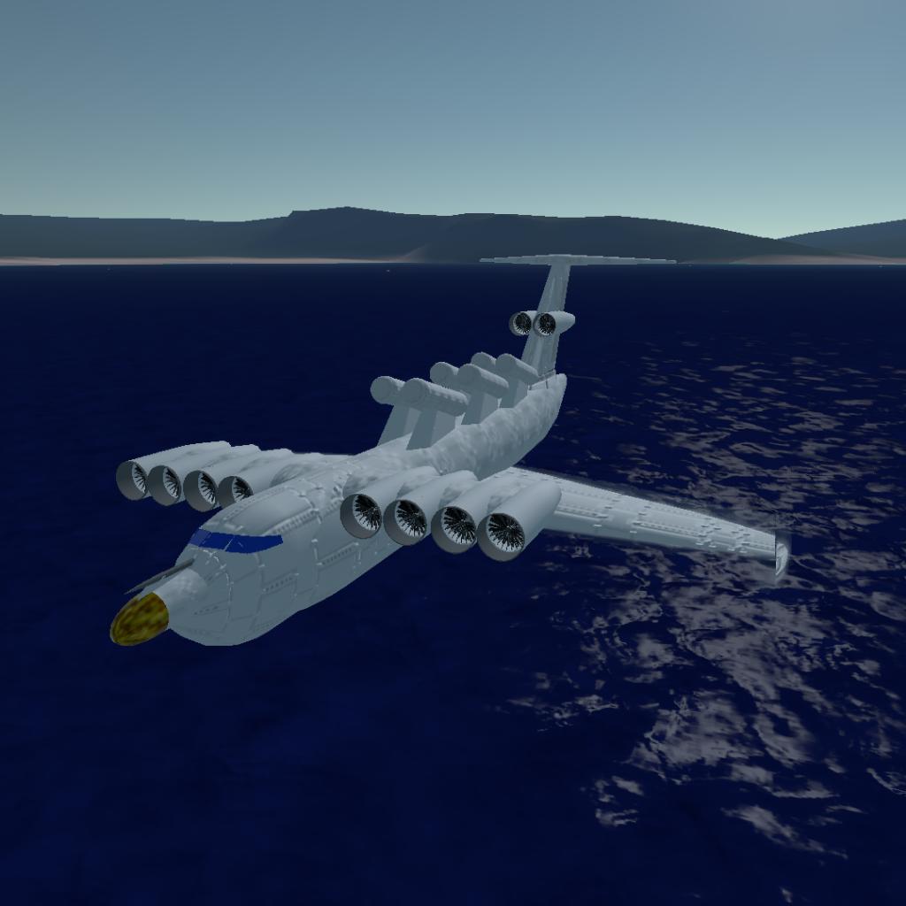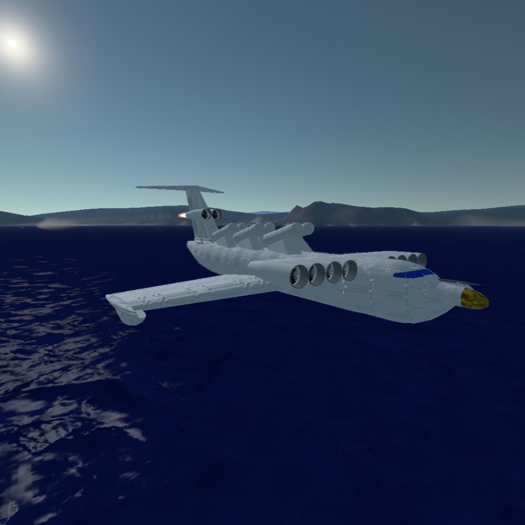 The Ekranoplan has a huge, flat, wing-like body, with a length of 73.8 meters (242 ft 2 in) and a height of 19.2 meters (63 ft)(in real life, but on JNO, its different). It's powered by 10 Kuznetsov NK-87 turbofans, 8 at the front and 2 at the rear. These engines provide the thrust needed to get it moving and keep it "flying" above water.