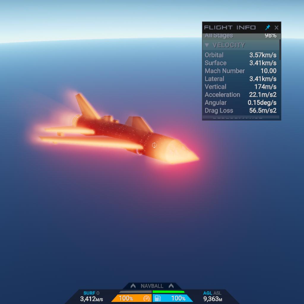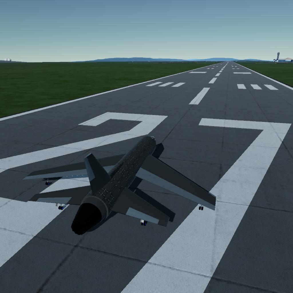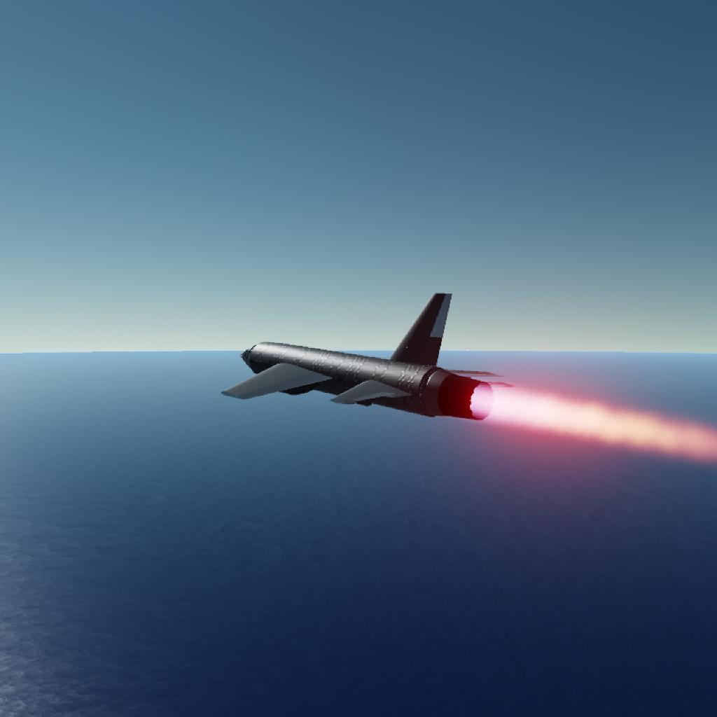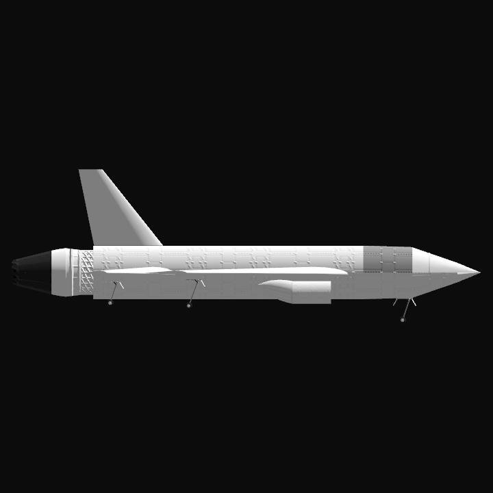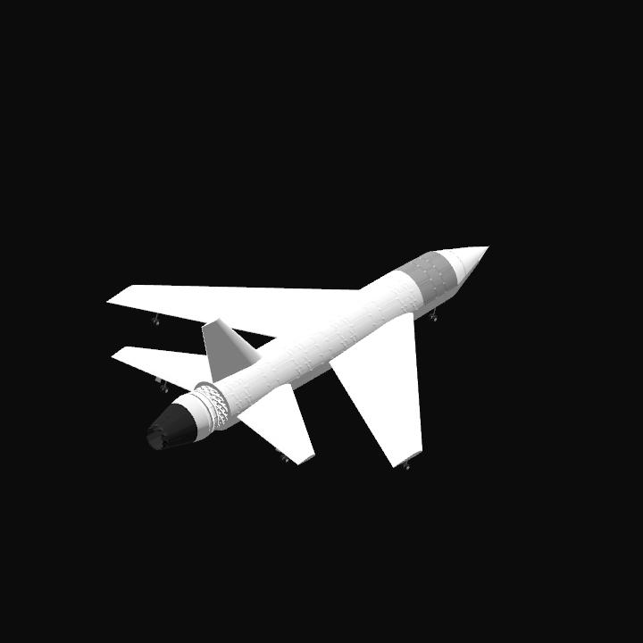 An aircraft with the capabitity to reach Mach 10 (in hypersonic mode). It has a cockpit and a lot of moving parts. It's much easier to take off in hypersonic mode because the subsonic engine isn't that great. Flaps are controled by Slider 1. The back wheels can be wonky in hypersonic mode.