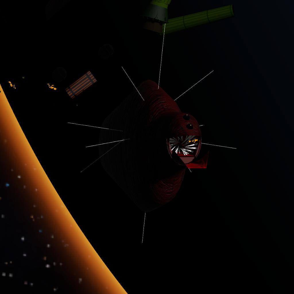 These living ships float through space feeding on space dust and change orbits frequently. They search mainly for hydrogen, their energy source and will even land on planets to find it.Qodo Vil are peaceful unless you are harming their environment or taking their precious Hydrogen. They have a thick acidic blood that is also used for digestion. They mix this acid and hydrogen in separate stomach chambers to produce propulsion. This yellow acid can also be used as a defense mechanism, melting spaceship hulls and other space creatures. But overuse will result in death. They have 30 teeth used for crushing large pieces of space rock but have been know to eat anything. They can have a very bad temper and are Sentient.They can see very well and feel the ripples in space time with their whiskers. Population is over 50,000 across the galaxy they havent needed to travel further ( Plenty of hydrogen), Need mates to multiply and when their eggs hatch they school like fish for 1 earth year. Their homeworld was Pajie way before the Paj ever existed but they quickly learned to fly and leave the atmosphere in search of more hydrogen. Their skin has evolved into tough armor, able to tank a couple laser blaster shots before falling. Four of them were feeding near Zula when the Ori began to destroy the planet. They attacked the spectating fleet, destroying 17 ships in their rage, killing 1700 Ori and themselves in the process. This is depicted in the pictures and build. lol