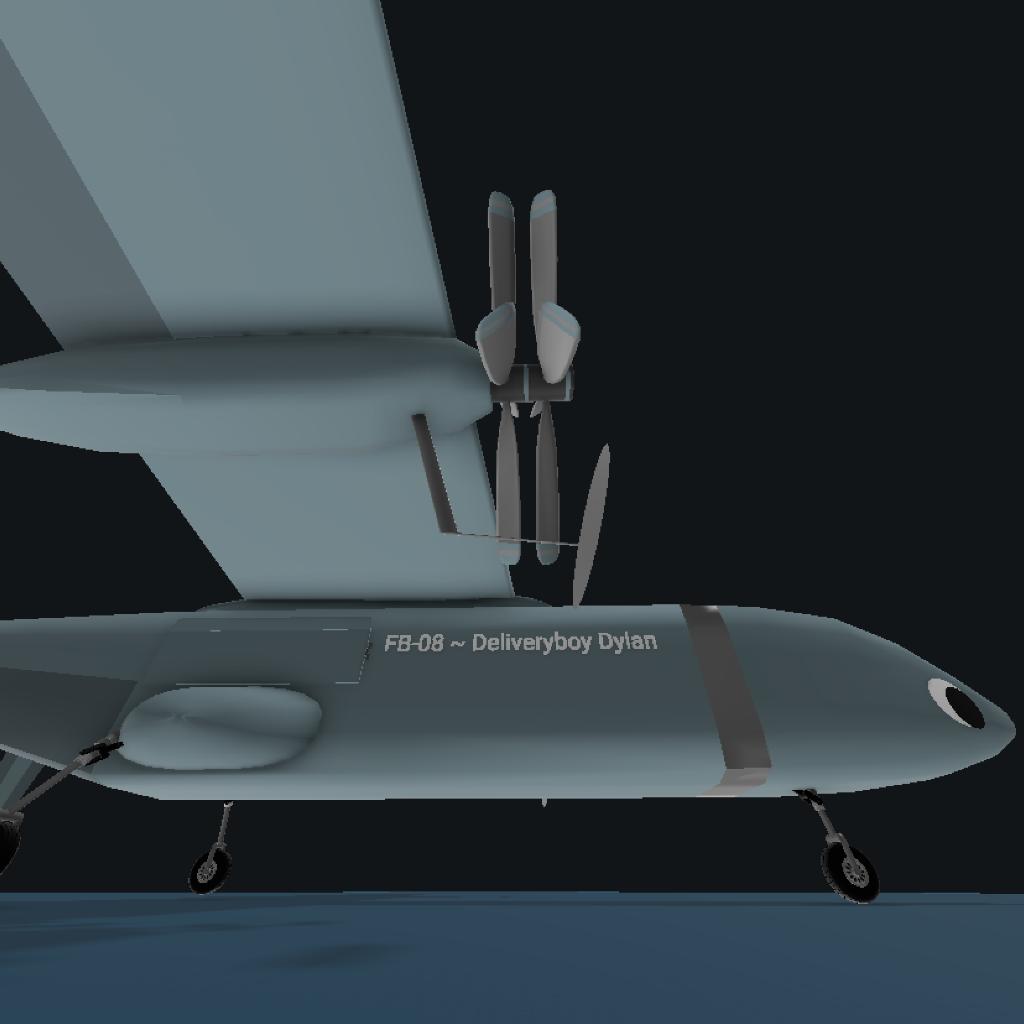 FB-08, or Dylan, Is a cargo plane, a derivative of FB-05 Sylvie. While he's not as fit for Sylvie's extremely long-range capabilities, He's perfectly fit for cargo and crew missions. He requires vizzy-controlled stabilization to work properly, He's SHOCKINGLY good for rescue and cargo missions, even on poor terrain (He even has bars to protect the props from striking the ground). He's cost effective, efficient, long-ranged, and can perform all sorts of missions.