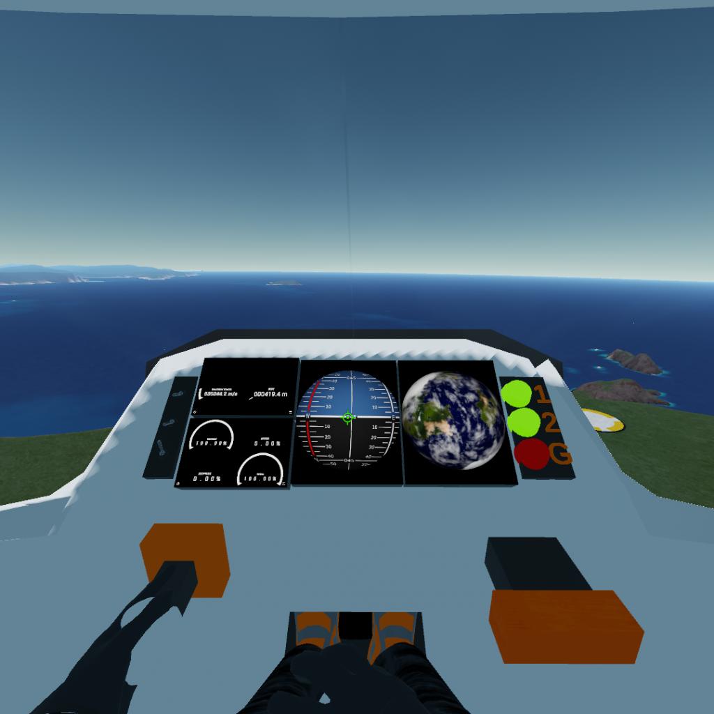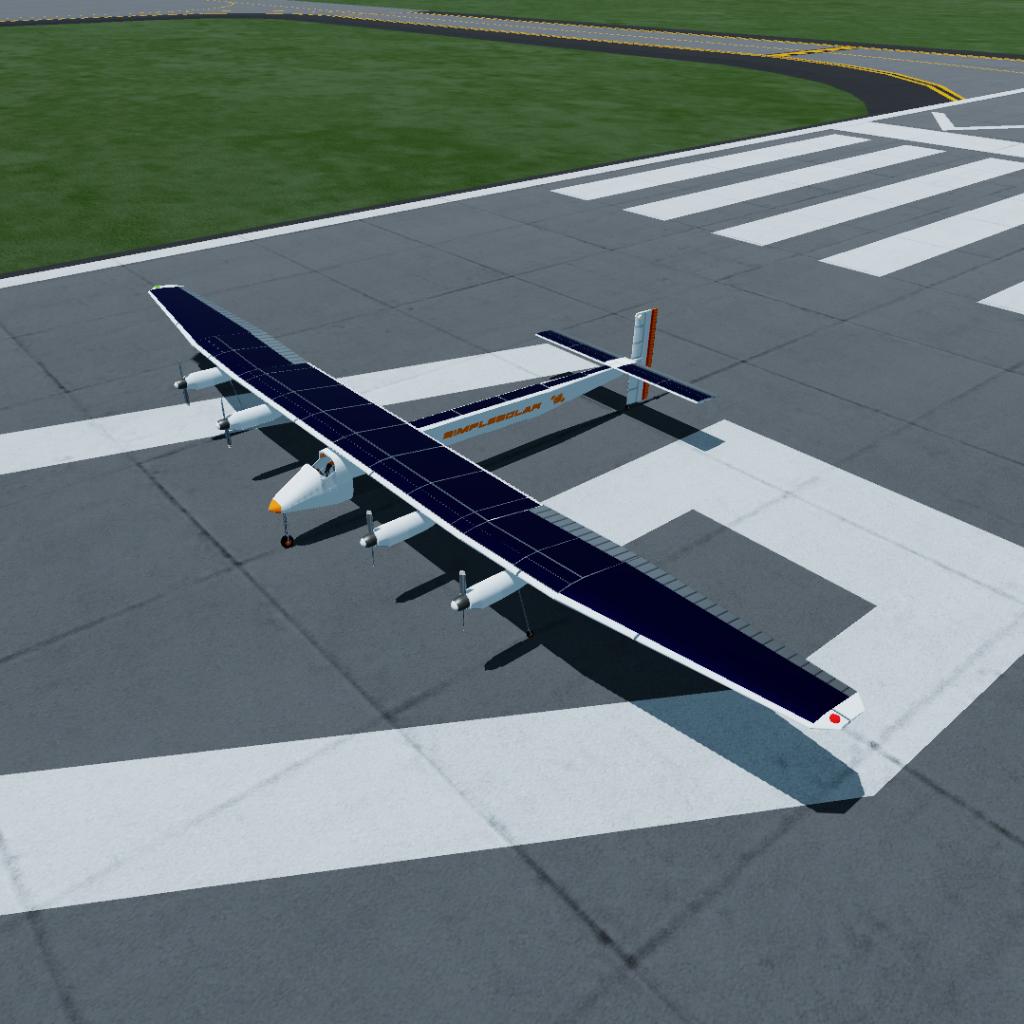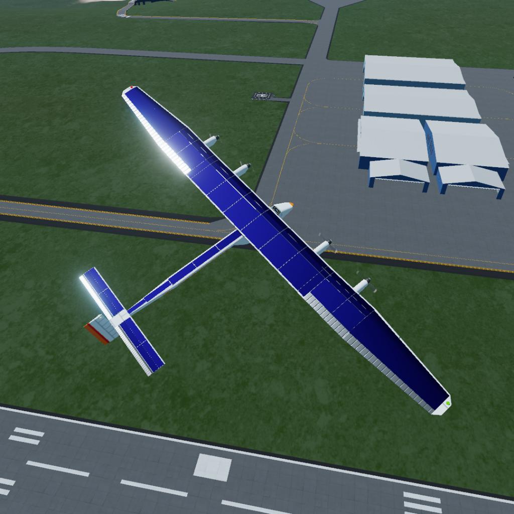 这架太阳能飞机参考了现实中的“阳光动力2号”,重量相近(2.2吨),但是翼展稍微小一些,这使它的起飞速度和最大平飞速度都比“阳光动力2号”要快一些(分别是30m/s和60m/s)。我为这架飞机添加了一个简单的仪表盘和操纵杆,可以切换到第一人称视角进行驾驶。我还为飞机添加了一个自动配平的vizzy程序,所以,请放心飞行。如同“阳光动力2号”一样,飞机装有一块蓄电池,所以它可以在夜晚起飞,不过我不确定它能不能完成环球飞行的壮举(大概率是不能)。