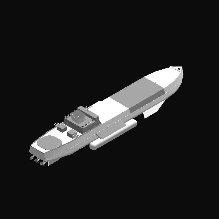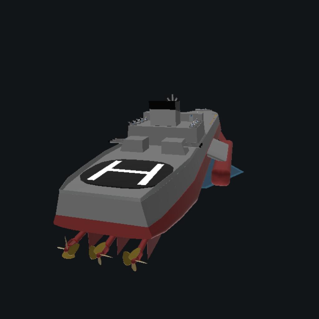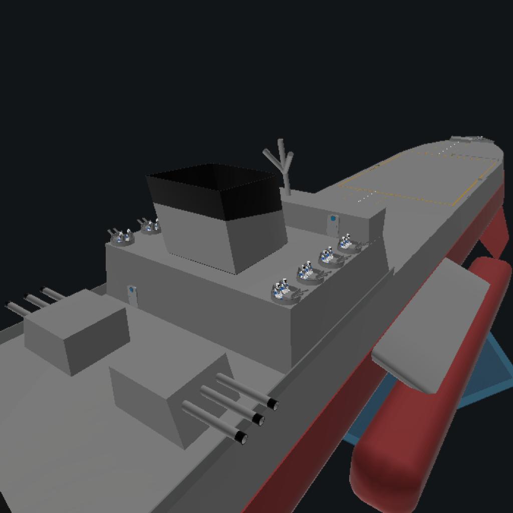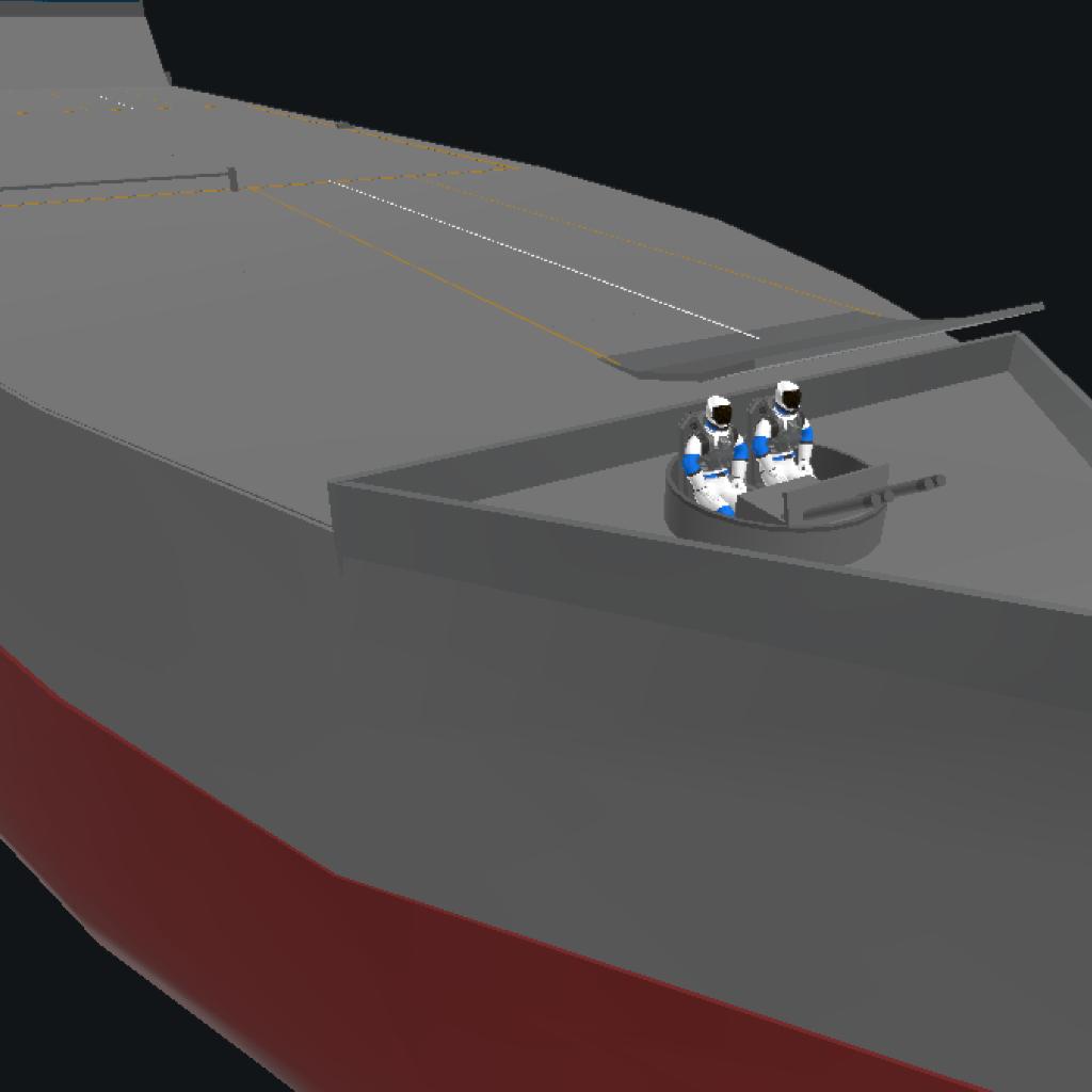 It's built from a cargo ship and in the bay it can hold 3 MQ-12 'Watcher' drones (Carrier based drones built for the Norvian Navy) for attacks and it has a helipad big enough to fit a AV-08B Harrier or F-35B Lightning on it. The ship also has arresting wires for Carrier-based figher jets to land on it (jets can't fit in the bay, they stay on the deck).