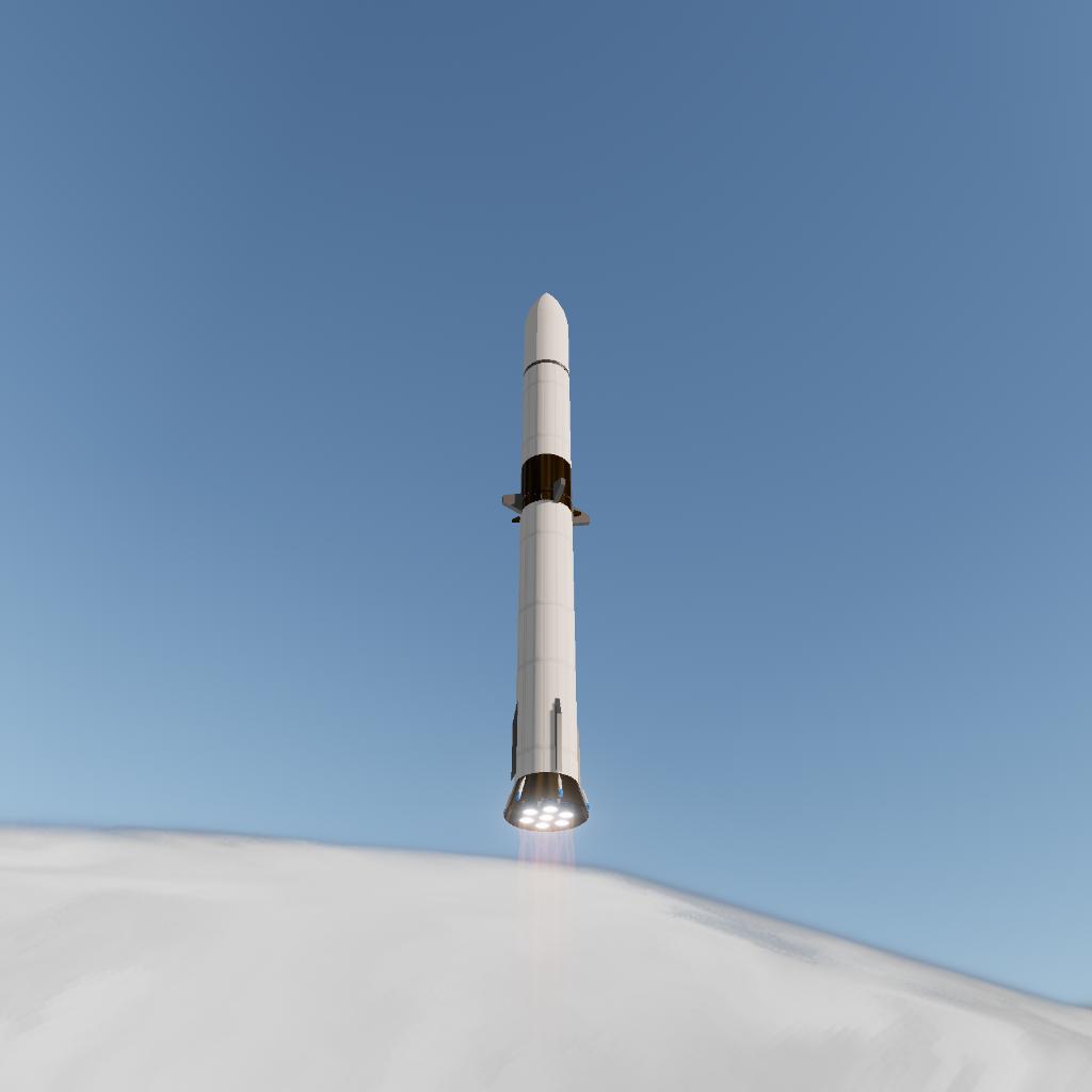 The first stage's return is a core feature of the GLEH's design. Following separation, the booster performs a boost-back burn and re-enters the atmosphere for a downrange landing. It is equipped with four drag brakes (controlled via the 'Brake' slider) for initial deceleration, supported by movable fins and rotators for aerodynamic guidance. Two high-torque gyroscopes provide attitude stability, while dozens of RCS thrusters handle precise maneuvering during the flip and landing burn. An entry burn is highly recommended to ensure structural integrity and recovery success.
