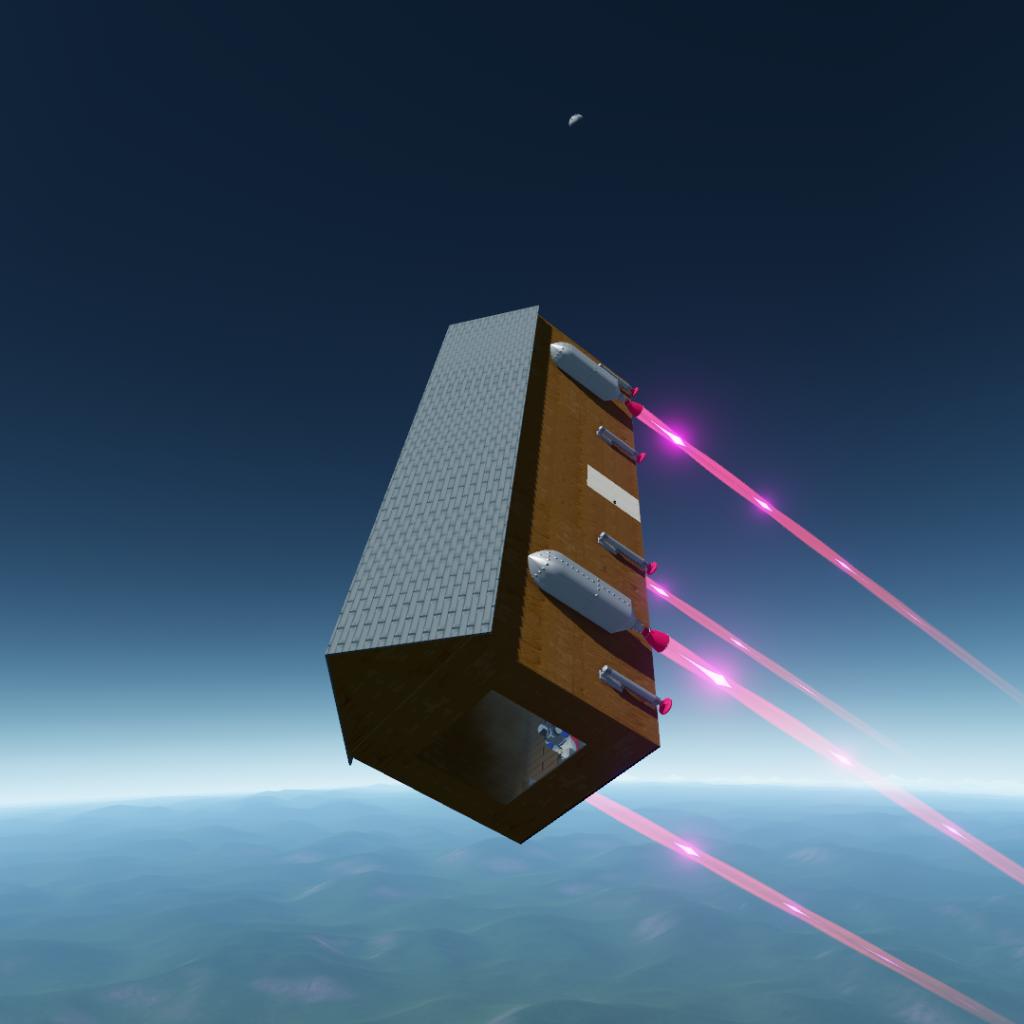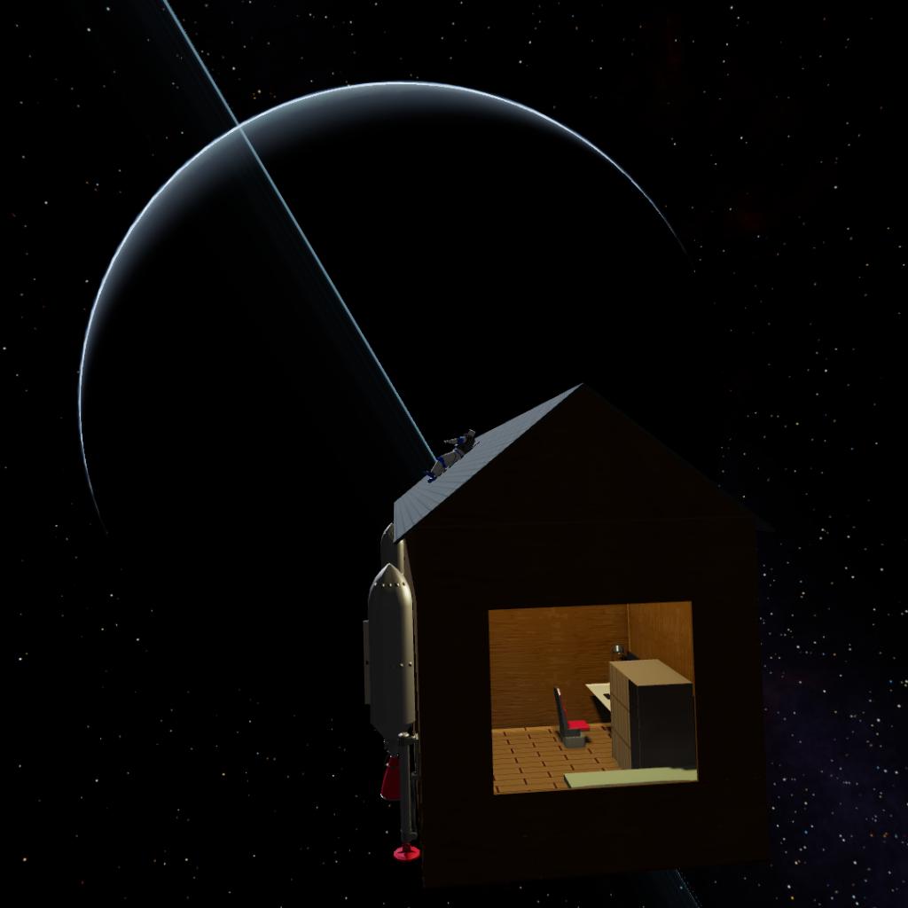 What should this spaceship look like? Living in a wooden cabin feels nice. Wooden planks are too fragile, so they are strengthened with magic. Engines are also attached. The small amount of magic used during construction can send its crew to other planets.