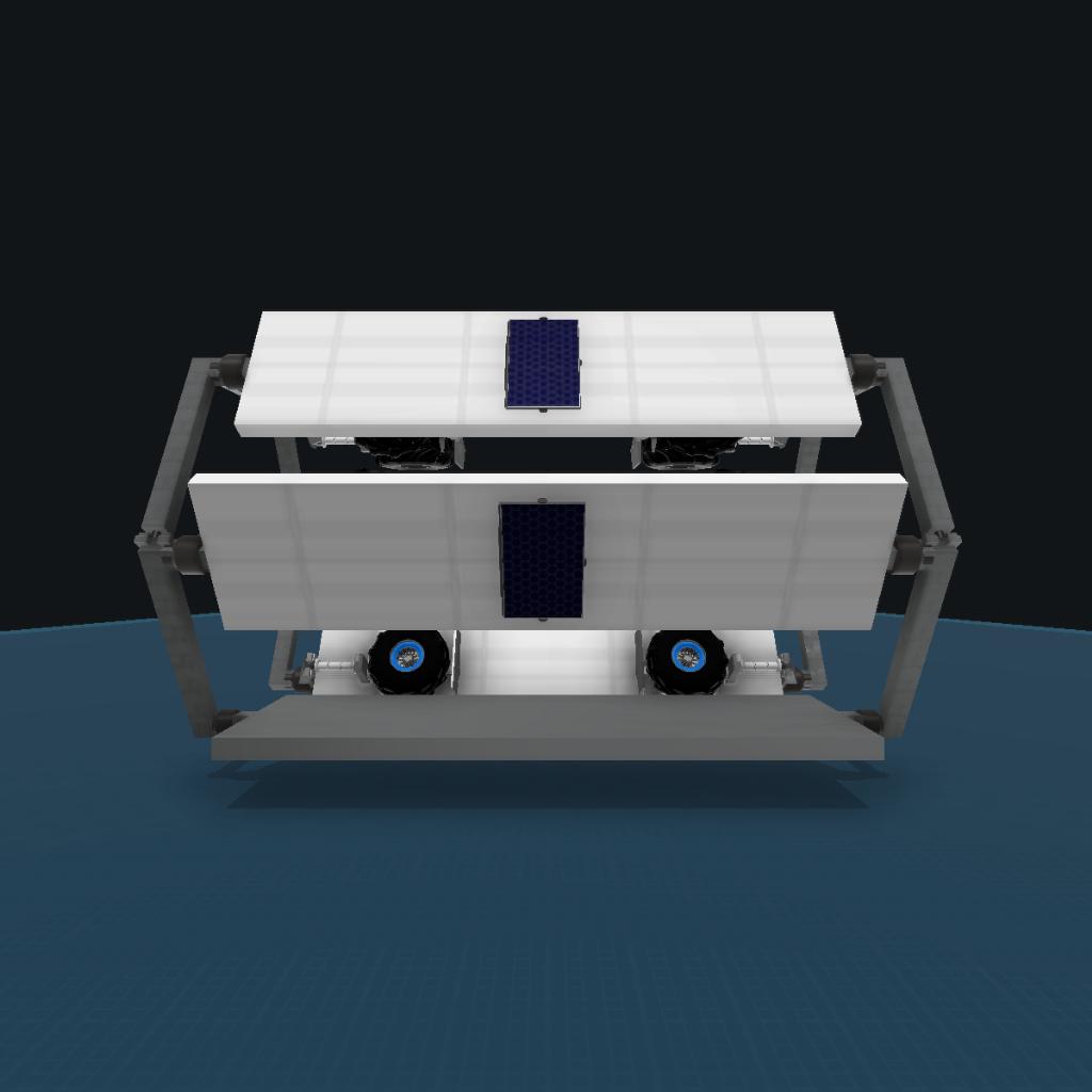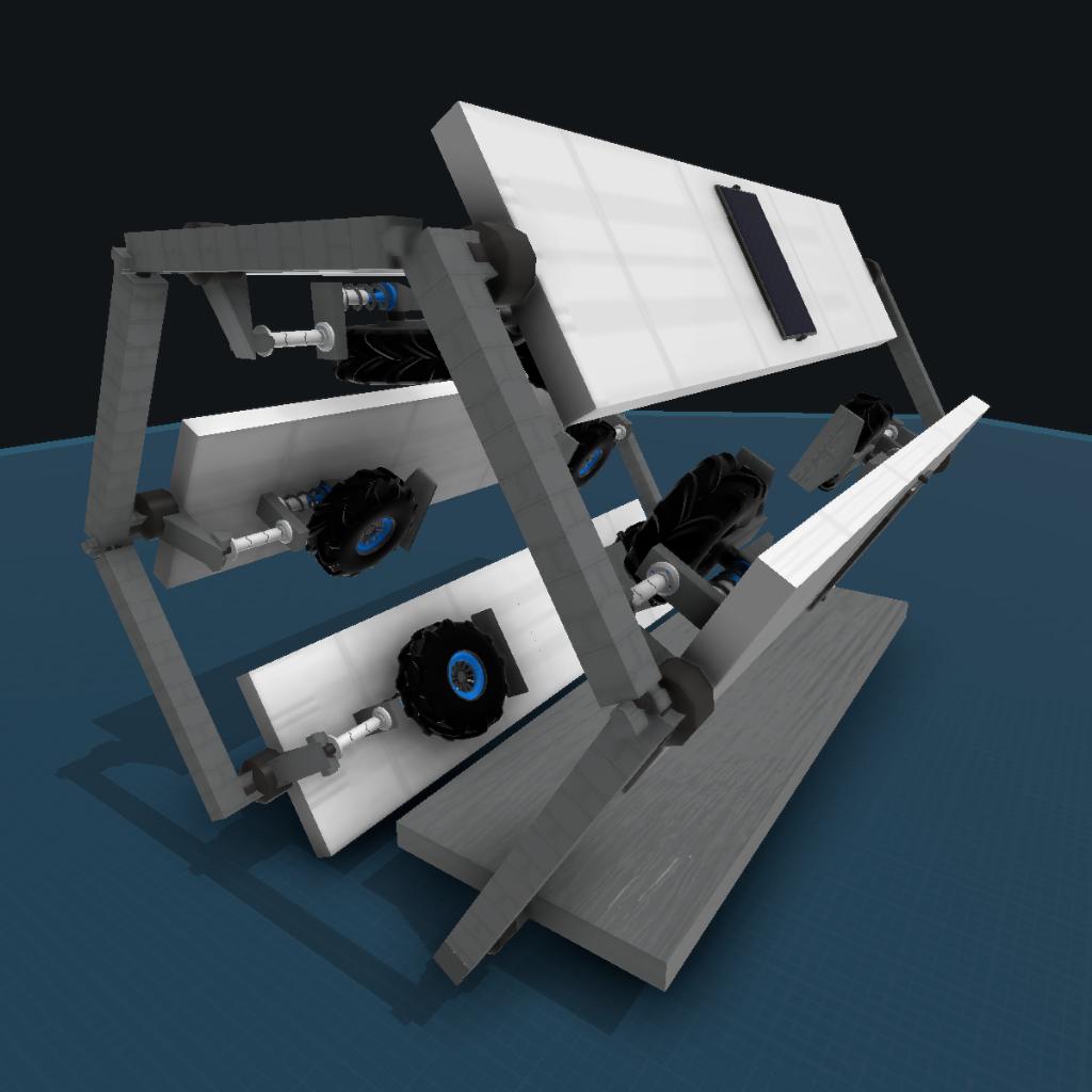 The Rolly Polly is a powerful rover that has the unique ability to roll into a ball- or in this case, a long hexagonal prism- and back into a flat vehicle. It has 10WD 4WS, high clearance, high speeds, and high stability. And best of all, it's easy to control with the 4 sliders! The 1st one unfolds it (just make sure you pull it down, not up). the 2nd one rotates each segment 180 degrees. the 3rd unfolds and extends the wheels, and the 4th allows for driving. Each segment is also equipped with a large solar panel for quick recharging! Tip: You should double tap/click the solar panel activator to recenter the camera!