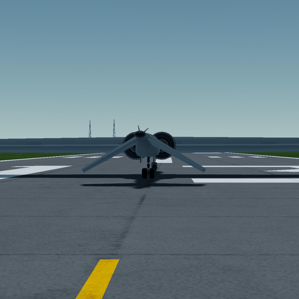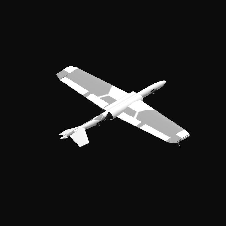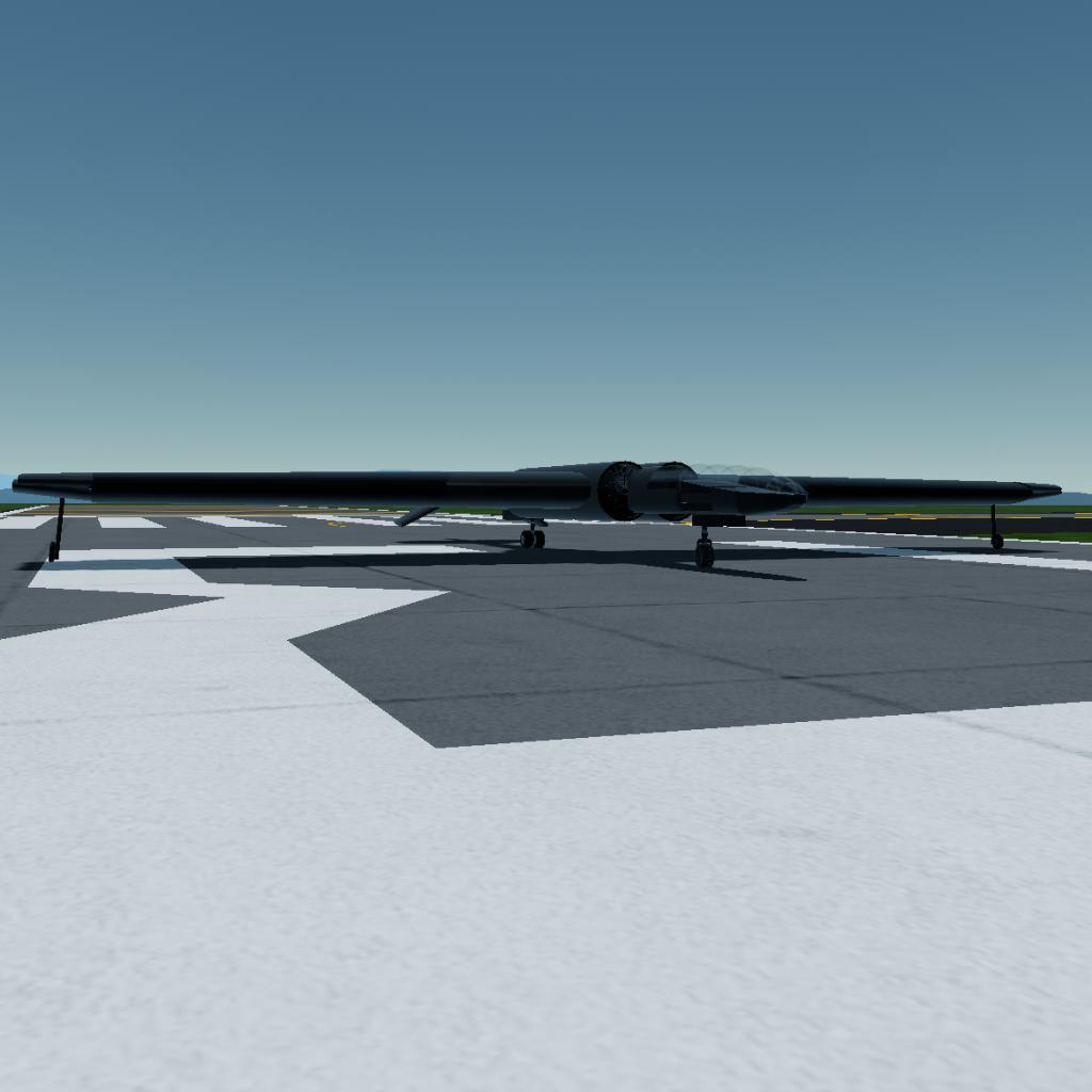 This aircraft uses a bicycle style landing gear, and also has 2 other support gears at the wingtips of each wing(that jetison when the plane goes above 23 meters above ground level). The Horizontal Stabilizers are in a upside down V shape since its the only way i got the plane to not go crazy after liftoff. It also lacks a Vertical Stabilizer, because since the Horizontal Stabilizers are at an angle, it acts like both a Vertical Stabilizer and a Horizontal