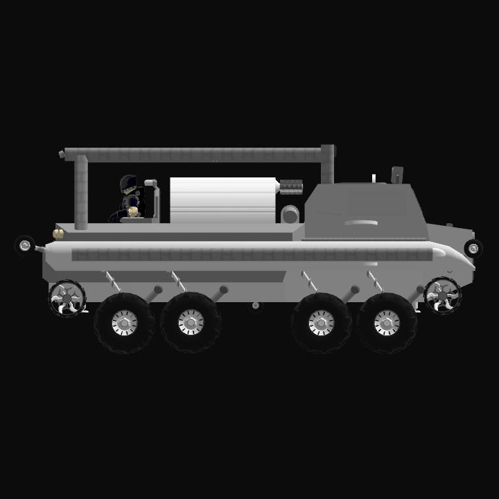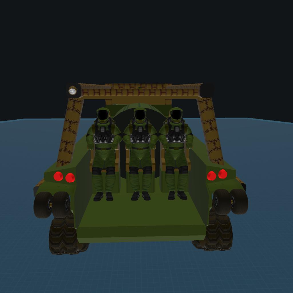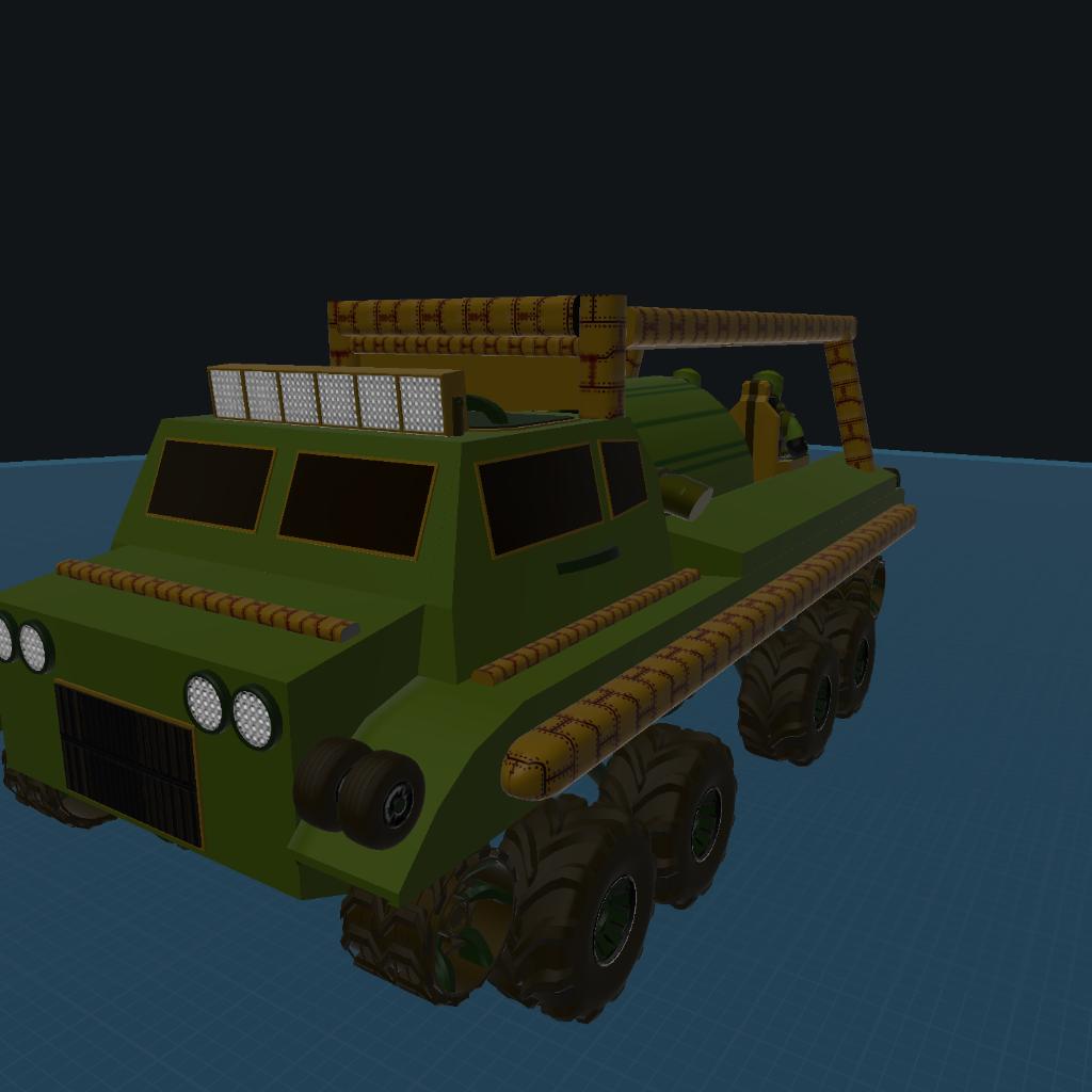 My military truck but with a few tinkers. Added working exhaust, stabilizer (use AG 4) added stuff to flip truck back over (also in AG) better lights, better power source, and lowered COG.