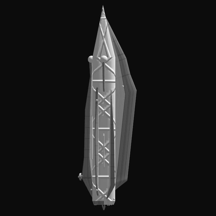 A battleship made for ramming ships, space stations, and even planetary bunkers and installations. Three frontal main laser batteries pummel the target before retracting, then the ship collides and boarding crews are deployed if necessary.