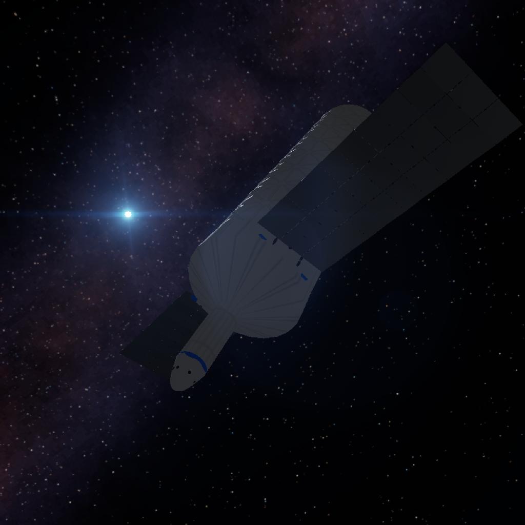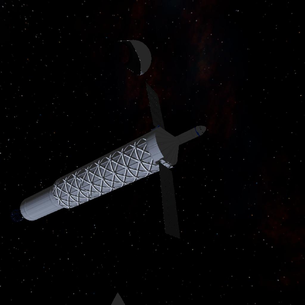 Huge, city sized spacecraft, having close to 1 Thrust/Weight ratio at the first stage, making it seem slow at first. But as the flight continues, this spacecraft reaches medium earth orbit, and then deploy its massive satelite, able to carry 967 people.