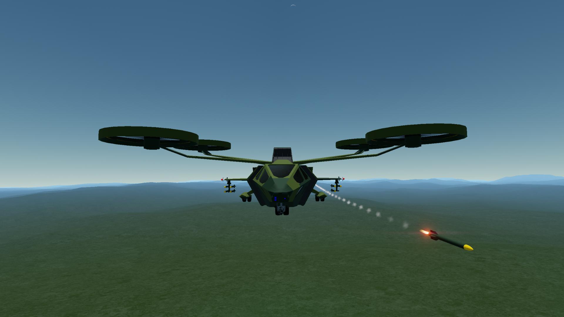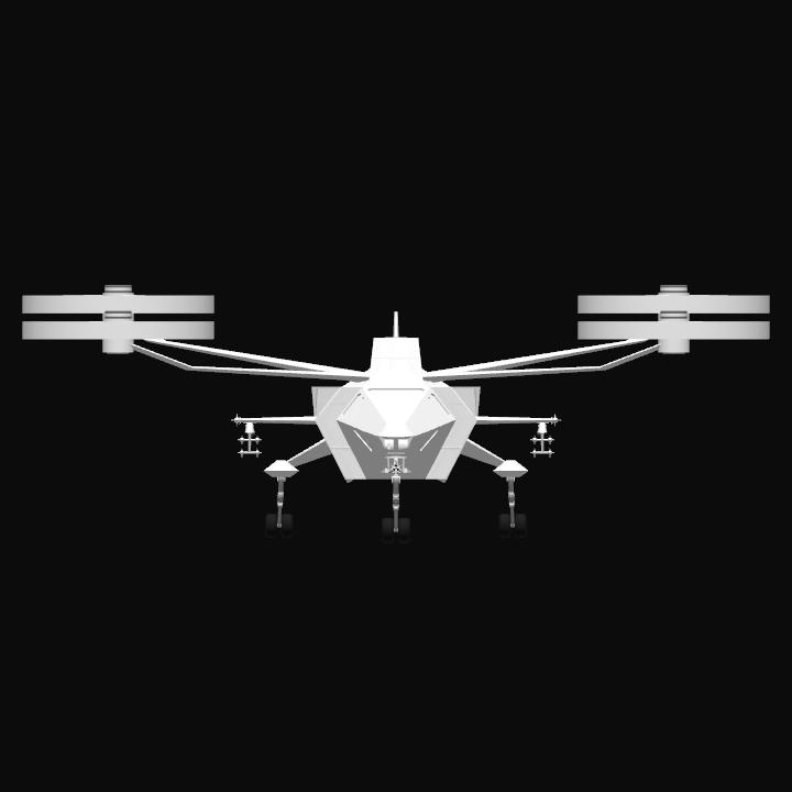 Defence force armed quadcopter. The ship has a programmable autopilot; player can enter the altitude/speed/heading for the autopilot to follow. Autopilot also has terrain/obstacle avaidance capabilities. Player can send the ship to land at a selected target, or tell the ship to land anywhere; the ship will scan terrain for a suitable spot, place a target icon, then fly and land there. Player can select/alter a manual landing site anywhere on the surface.