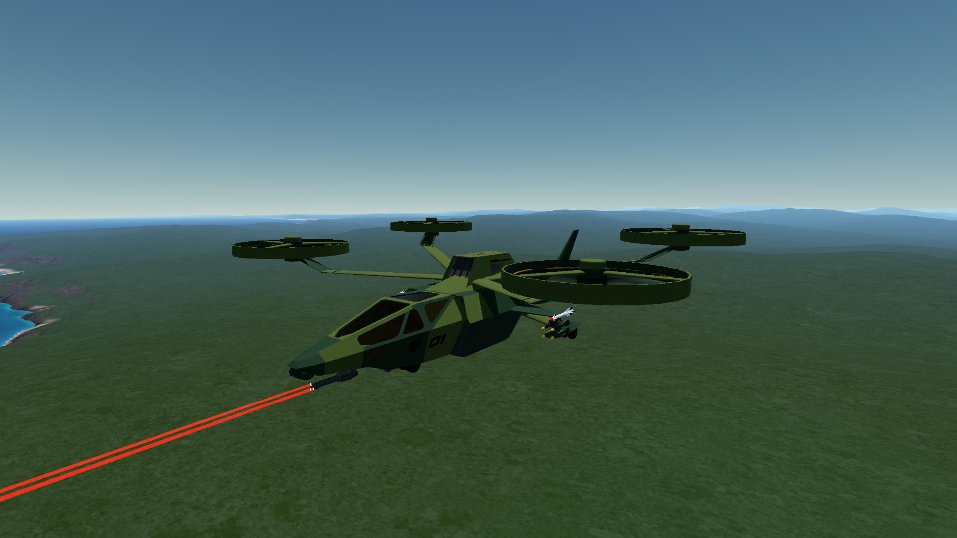 Ship is armed with self targeting gatling laser and optics. 2 air to air self guiding missiles, and 8 air to ground self guiding missiles. Manual landing targeting can be used to select a manual position for the canon and missiles to target, in addition to traditional object targeting. Missiles have a range equal to your max physics range.
