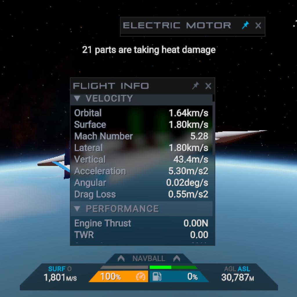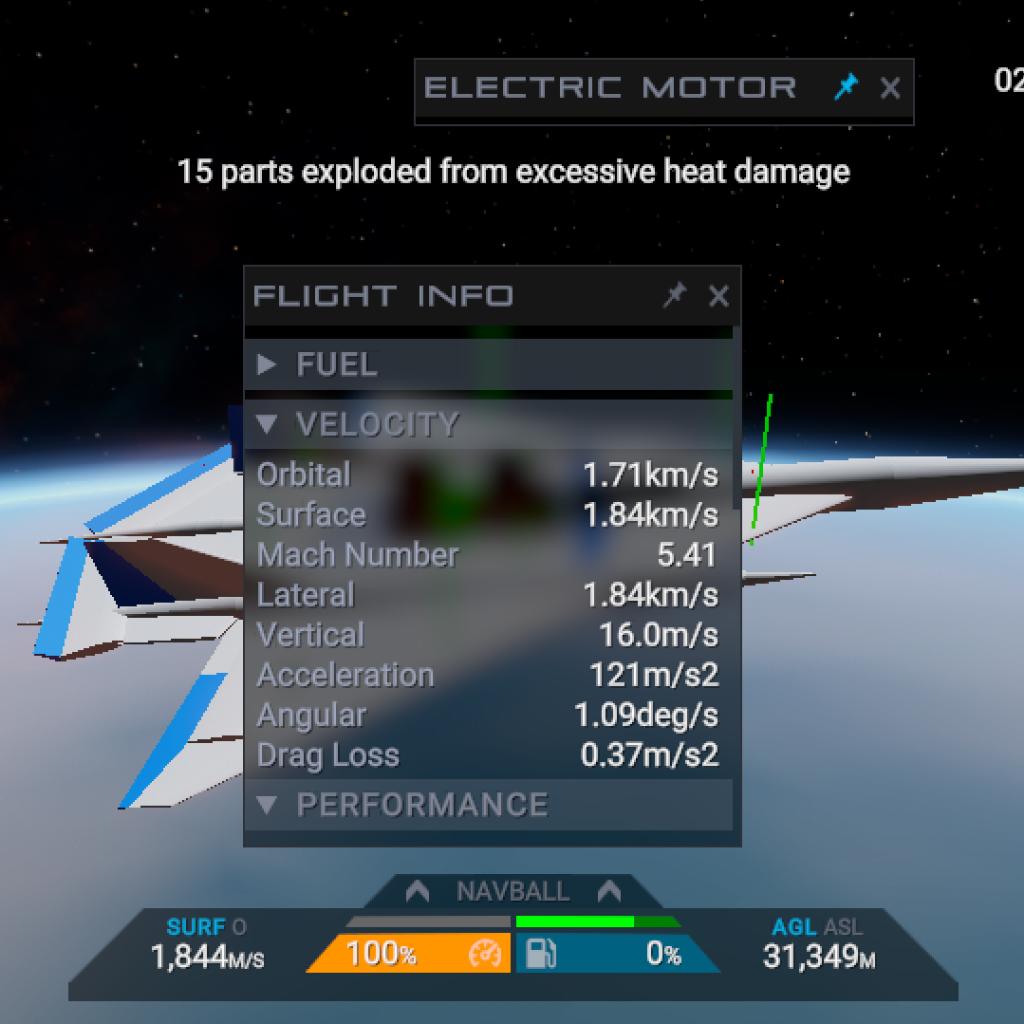 So how on earth got to Mach 10, I was only surprised when I see this result, So basically I was messing around at Flight Info when I discover heat damage at the bottom, so I set to 0(zero) to see how truely fast this thing, remember it still use electric, when setting at default it can reach Mach 5 before getting blown up by the overheat, when set to 0 it reach uh Mach 9.74 before getting to space