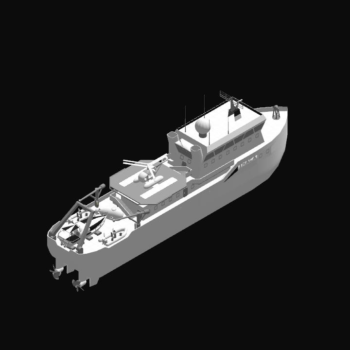It carries a helicopter, speedboat, submersible, and two dinghies.