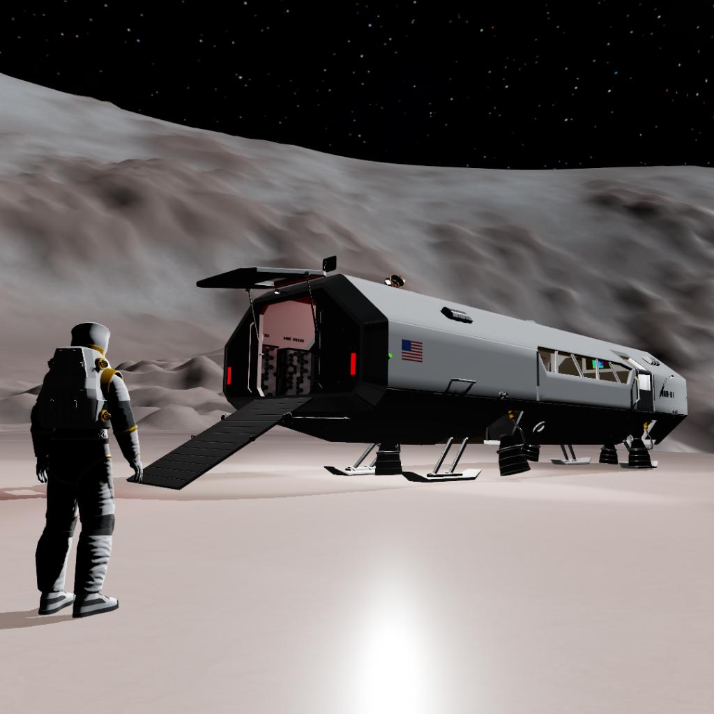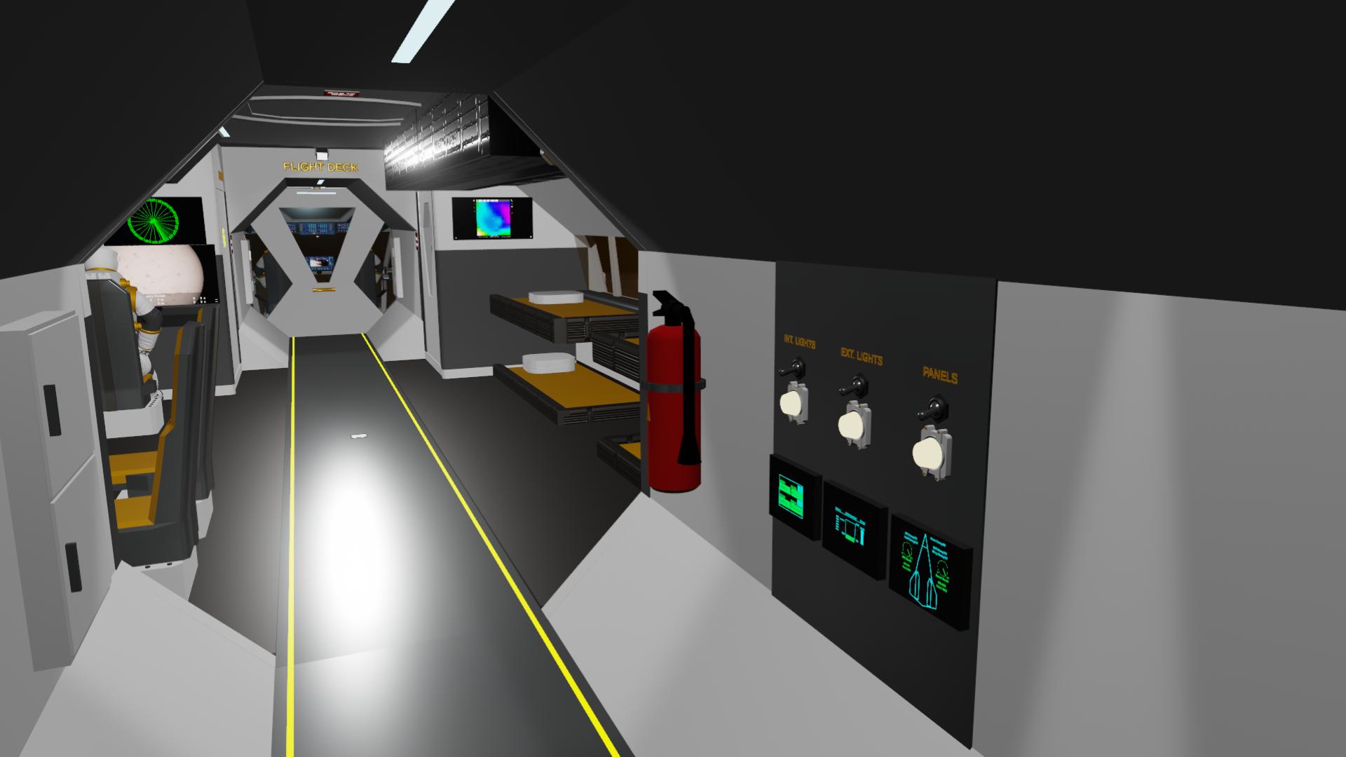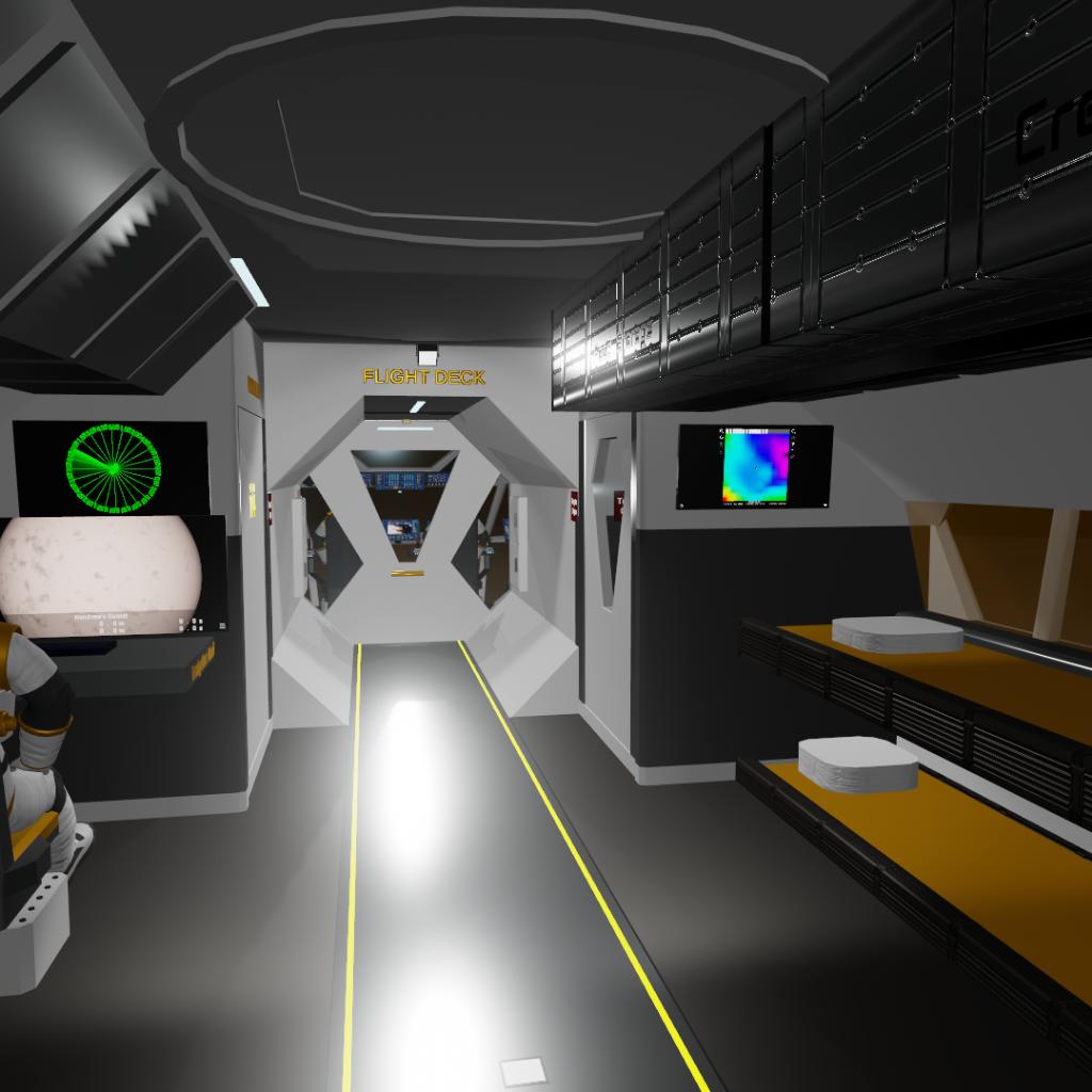 The ALH-01 has space for 4 crew. The inside has been furnished with: 4 Beds, Custom MFDs, 2 Desks, 1 Bathroom, 2 Airlocks, 1 Docking Hatch, Realistic Cockpit, and Functional Storage Compartments!