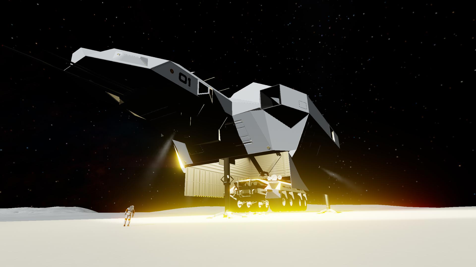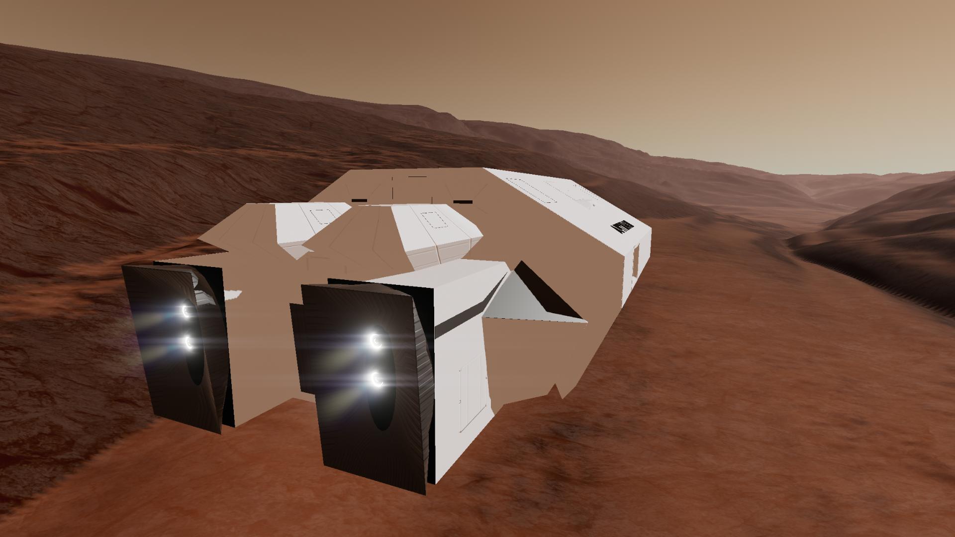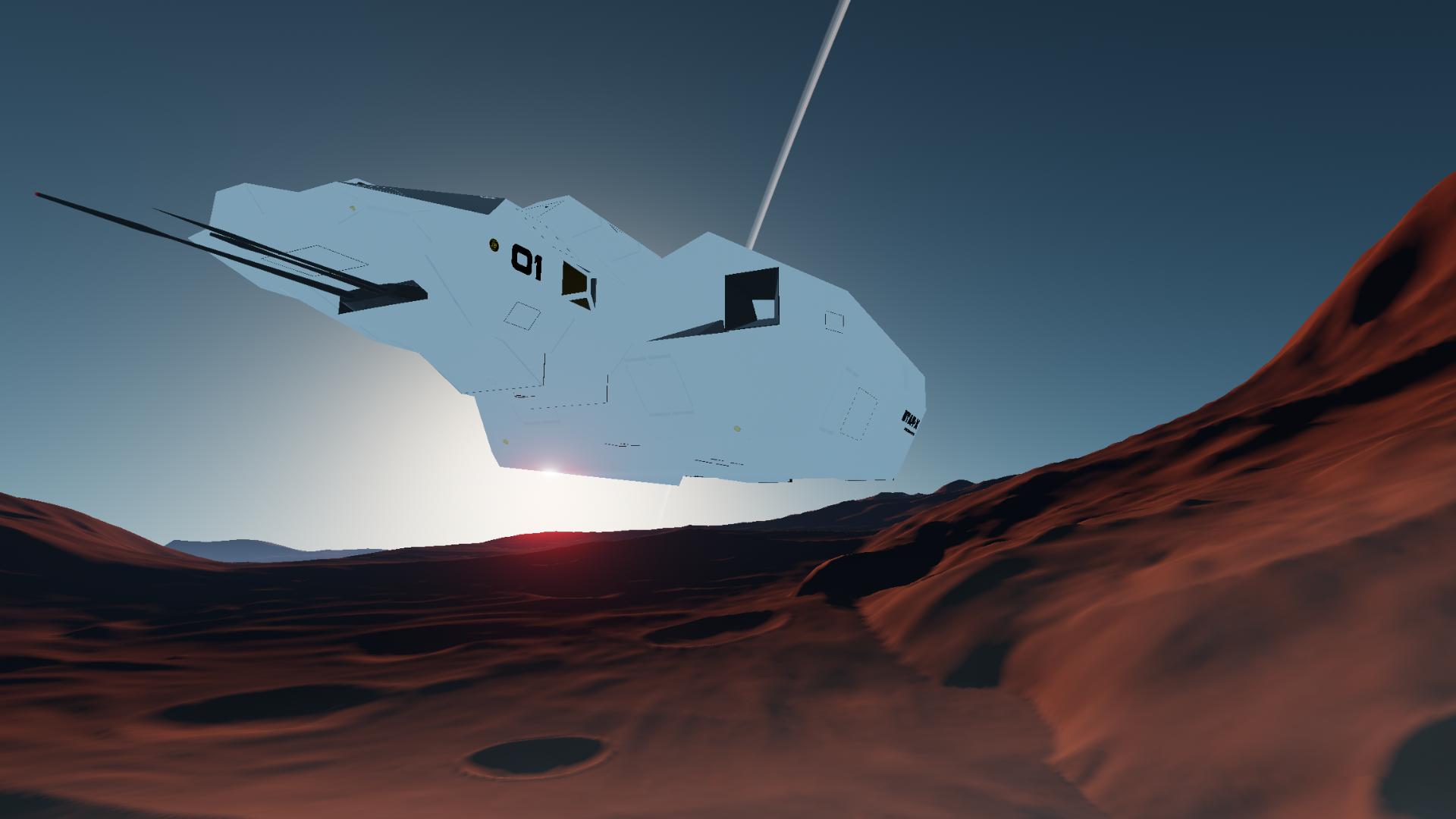 The colonizing worlds work horse, heavy transport for getting all the CW vehicles/buildings/equipment to their offworld destinations. Massive 5000 cubic meter cargo bay. The ship has a programmable autopilot; player can enter the altitude/speed/heading for the autopilot to follow. Autopilot also has terrain/obstacle avoidance capabilities. Player can send the ship to land at a selected target, or tell the ship to land anywhere; the ship will scan terrain for a suitable spot, place a target icon, then fly and land there. The ship can also land anywhere, or at a target from orbit, the ship will perform deorbit maneuvers. Player can now manually change/select landing co-ordinates.