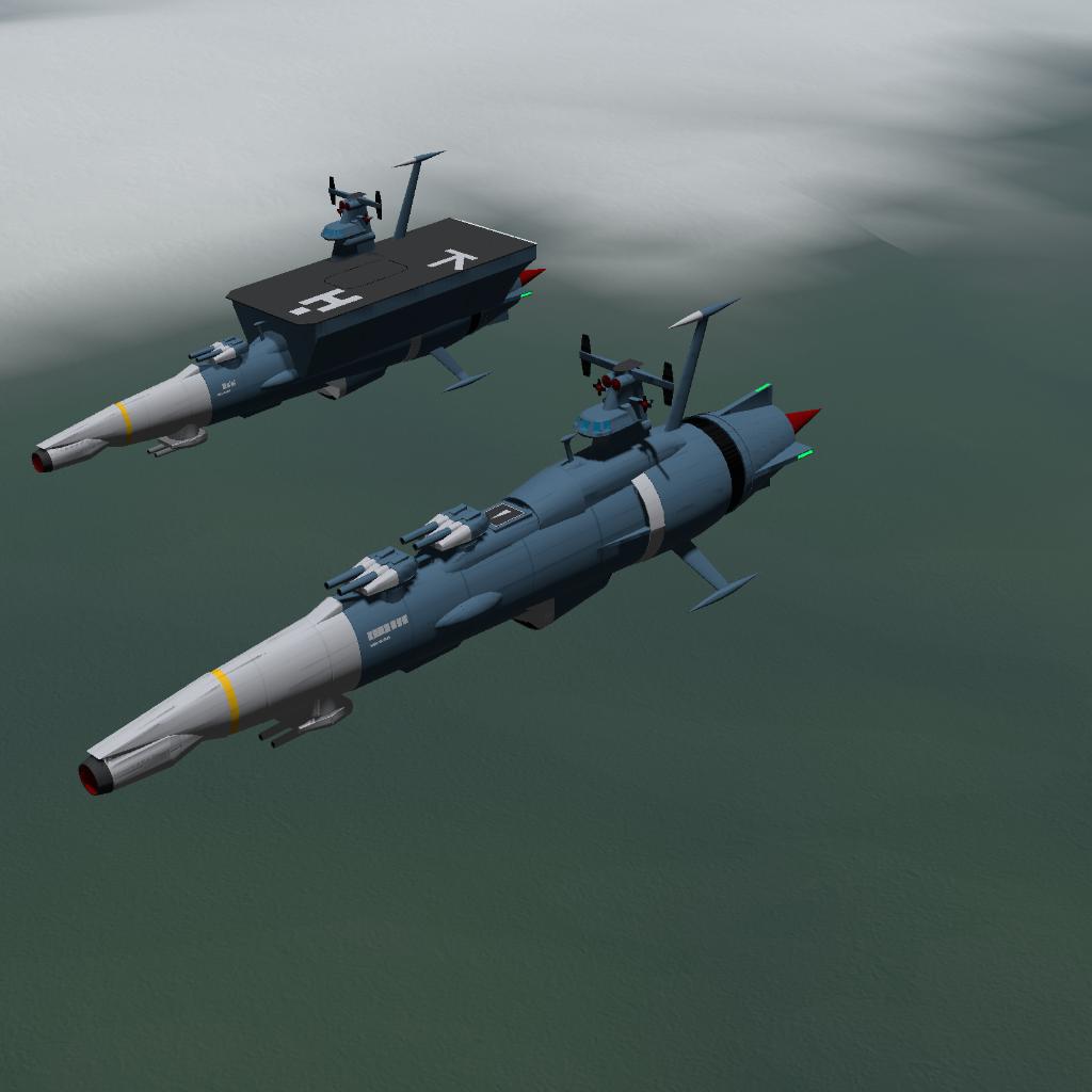 The patrol ship is characterized by its cylindrical hull shape. It is said that German design and the metric system were used. The artillery includes a small Wave-Motion Gun in the bow, a positron turret (known as the MK.12 twin 127mm guns), and two triple torpedo tubes (MK. 32, 324mm) on each side of the front of the hull. In addition, behind the lower twin turret is the departure and landing port of carrier-based aircraft (presumed to be a Cosmo Seagull).