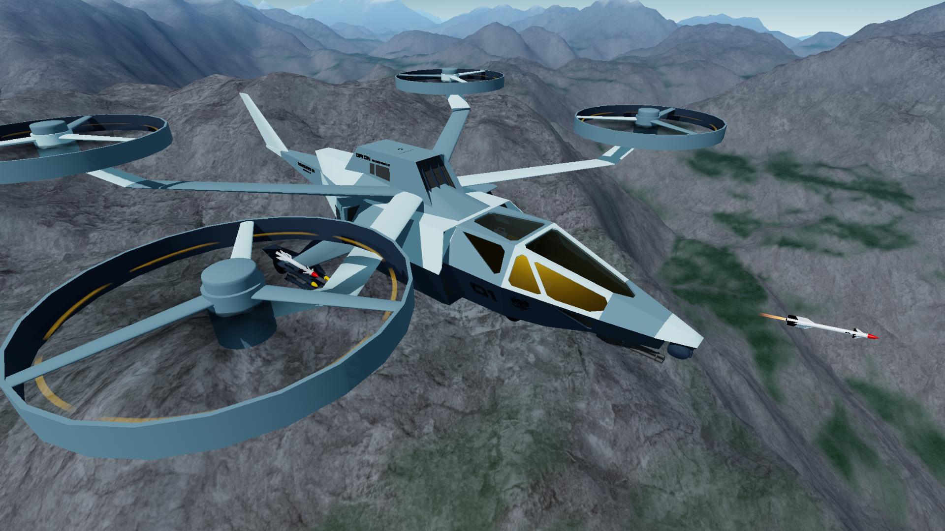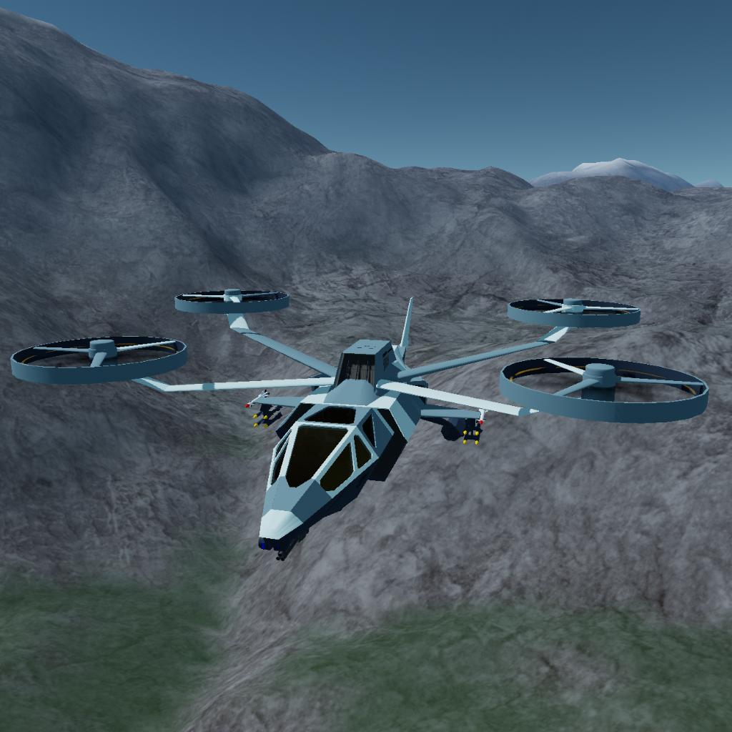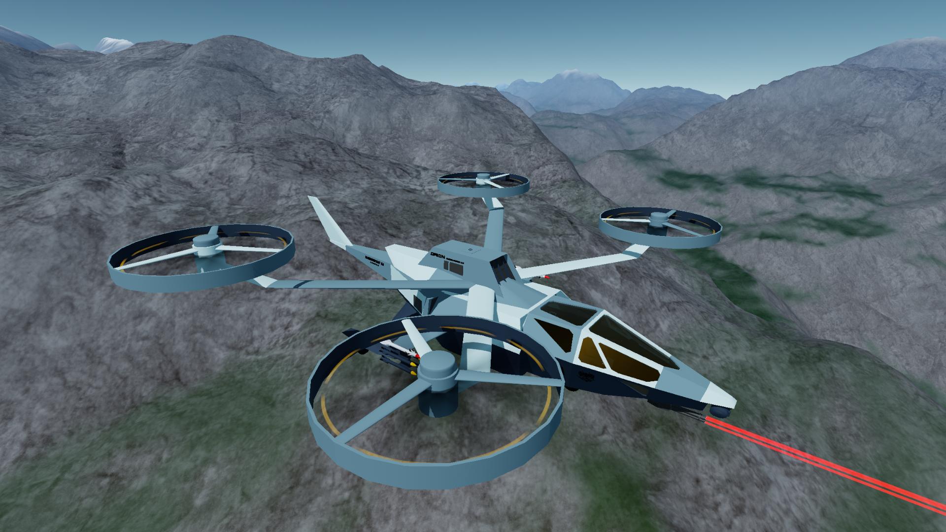 Defence force armed quadcopter. The ship has a programmable autopilot; player can enter the altitude/speed/heading for the autopilot to follow. Autopilot also has terrain/obstacle avaidance capabilities. Player can send the ship to land at a selected target, or tell the ship to land anywhere; the ship will scan terrain for a suitable spot, place a target icon, then fly and land there. Player can select/alter a manual landing site anywhere on the surface.