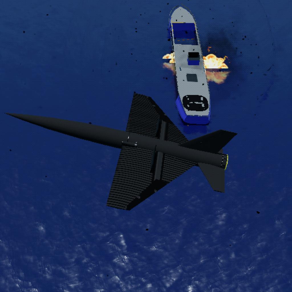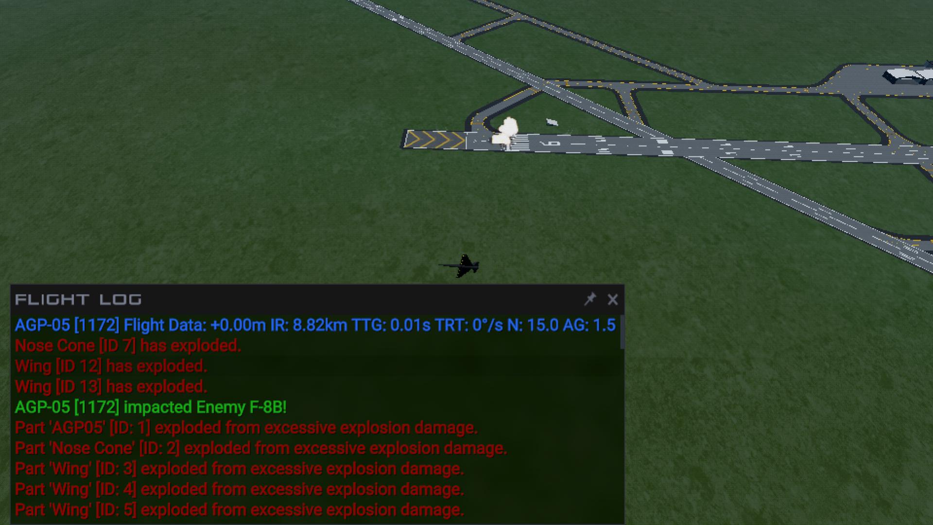 This weapon is compatible with all Alpha Space Technology developed aircraft with 2nd Gen Fire Control System (NOT Gen 1). Just select a target on the jet, and deploy ordinance via Activation group powered Fire Control System on board said jet (FCS instructions sold on separate aircraft). The AGP-05 will automatically glide towards to target and detonate upon impact, if within physics range. A line of sight between the launching point and the target must be maintained for a successful launch; The AGP guided bomb series DOES NOT feature a ground collision avoidance system.