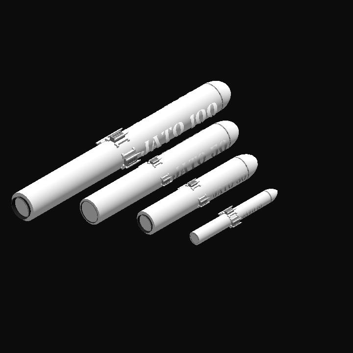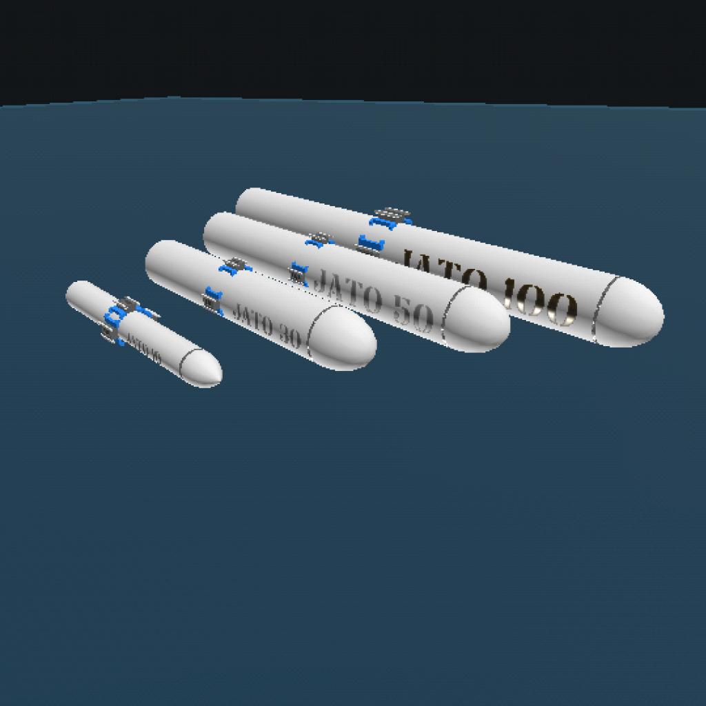 JATO Rocket Boosters are meant for attachment to aircraft to aid in takeoff acceleration. They come in assortment of sizes and, from least powerful to most powerful, are listed below.