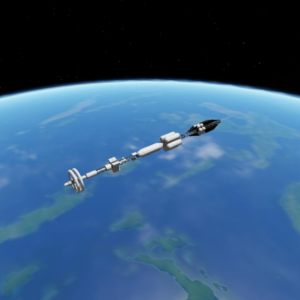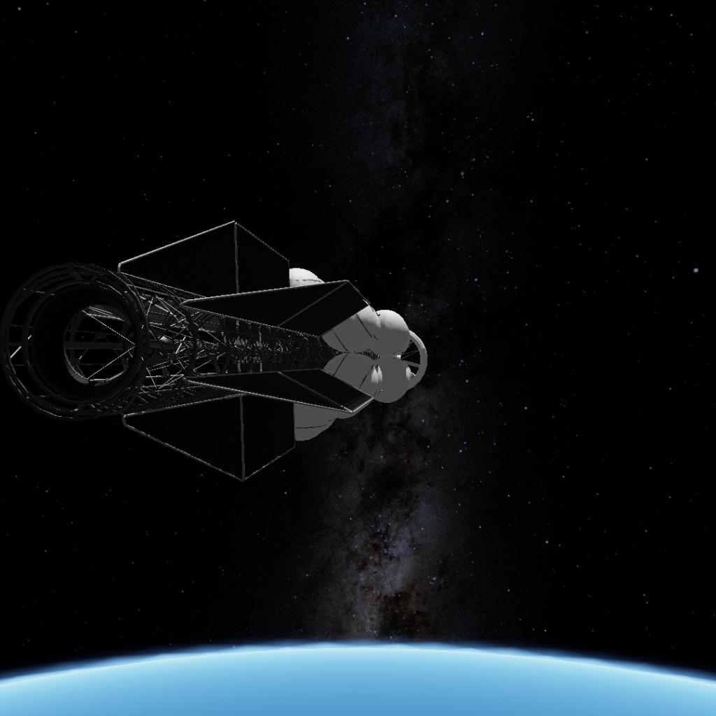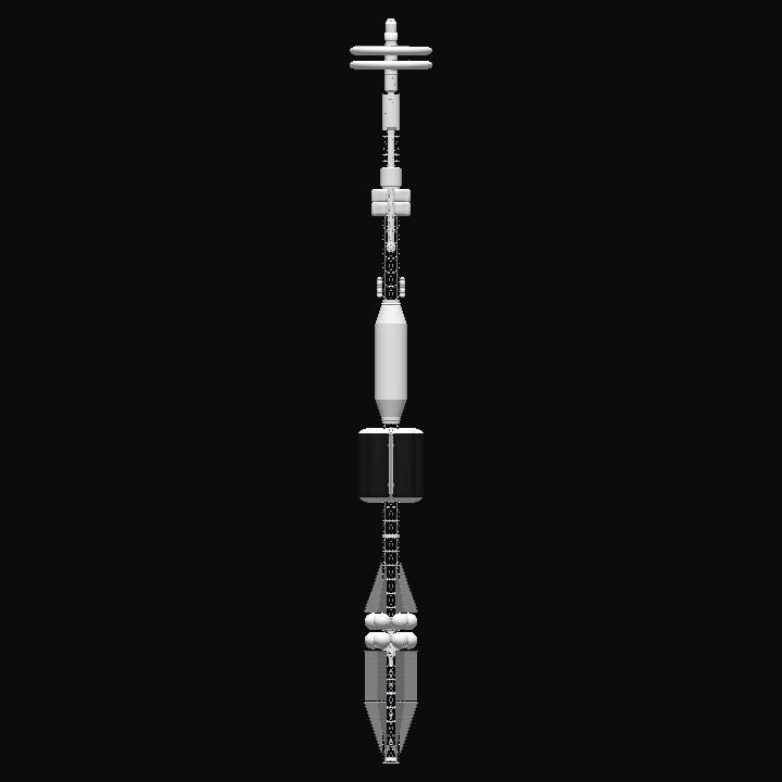 The spacecraft was designed for manned exploration missions of Saturn's moons, and the original design came from YouTube. The spacecraft can carry 5 separable cargo compartments at a time, and also has a large-capacity cargo compartment. Two rings of gravity that rotate in opposite directions provide living space for dozens of people. It can carry an SSTO to land Titan,The spacecraft's thrust-to-weight ratio is very small, and it takes several days to lift its orbit to a geosynchronous orbit (36,000 km) before it can change orbit to other planets