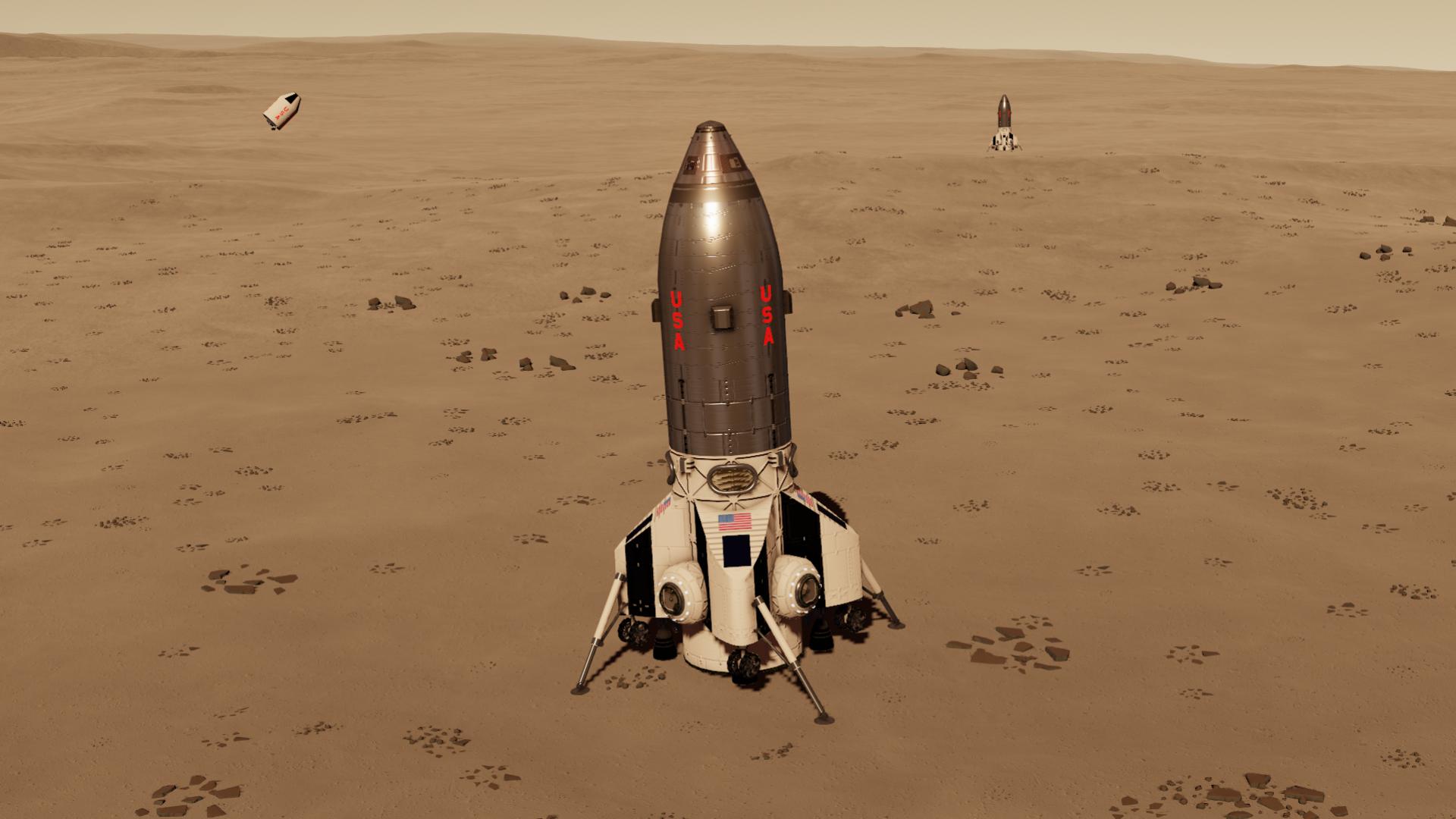 Direct Lander, Mars Rover, a Plantable Flag, Capsule Control Panel, Habitation Module with interior. Complete mission from Launch to Parachutes.