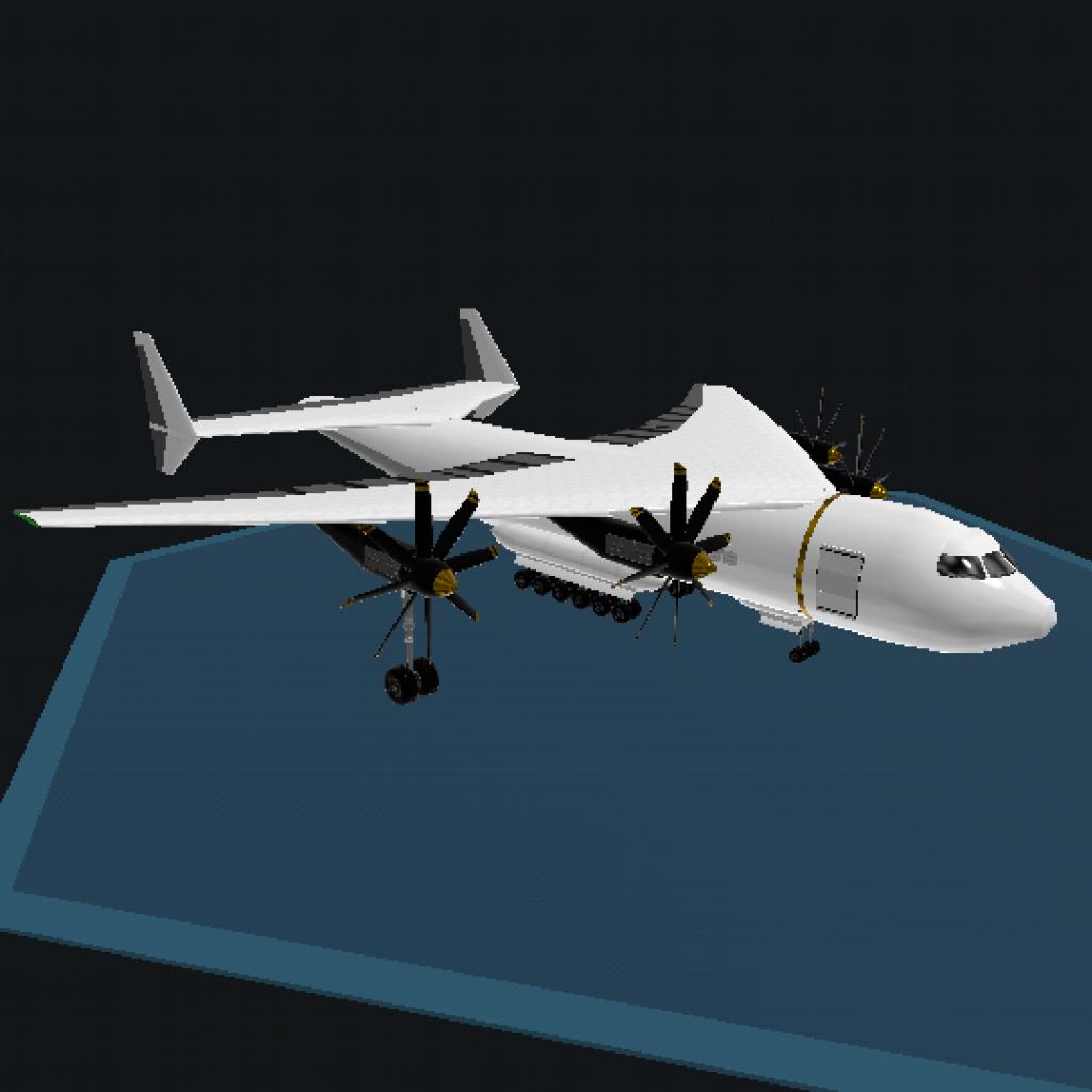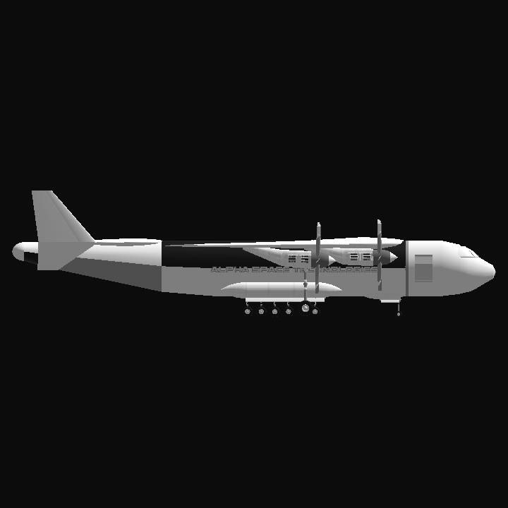 What the overworked and underpaid interns at Alpha Space Technologies developed is the C-300A SteelWing. It is a medium lift, STOL capable, redundant and workhorse air lifter that can carry cargo to remote, dangerous, and needy locations. Powered by electric propeller motors that feed off of jet fueled generators, It features capacity for six crew, and a relatively spacious cargo bay for lifting medium freight loads. To access that freight, it features a rear ramp and also an operable nose cargo door that extends sideways to expose the inner fuselage, allowing easy access for Air cargo lifts. The rear cargo ramp also allows for air drops. The aircraft features acceptable turning radius and maneuverability, excellent TWR, good wing area and lifting surfaces, and helpful flight information and displays. While range was not made a priority in this design, it still features a 3000km range, which is acceptable for mainland to FOB operations (future cargo airlifters will be made for long distance hauling)