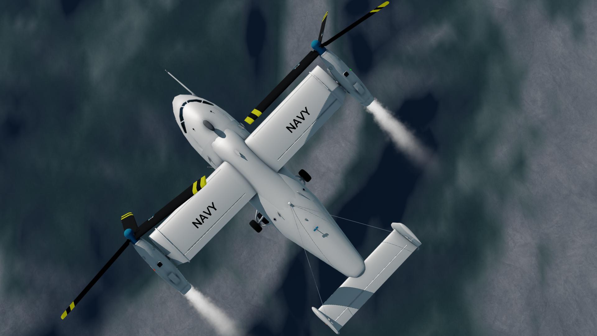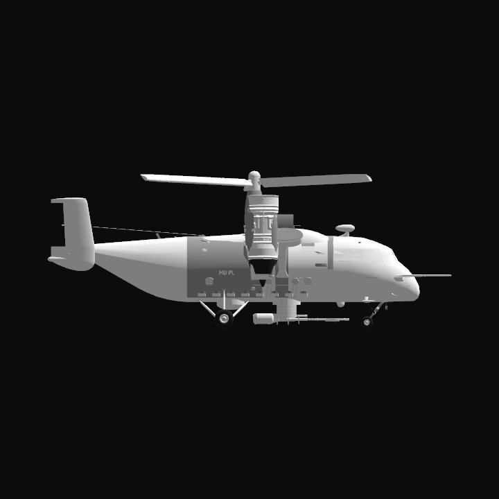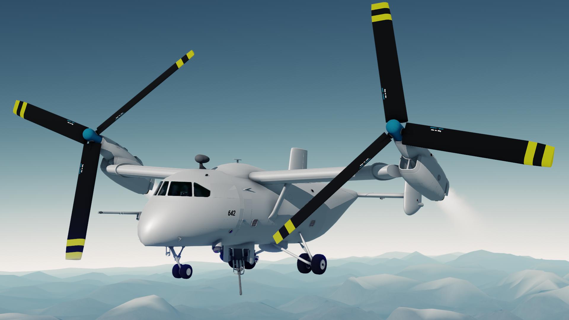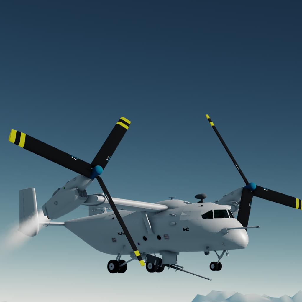 A tiltrotor all-weather aircraft, armed with a 50mm autocannon and a capacity of 18 passengers (plus the pilot, copilot, WSO and RSO). Its primary use is to deliver armed troops and support them with its gun. Effective against both unarmored and medium-armored enemy units, although it can knock out MBTs or weapon systems of enemy gunboats. It can carry up to 15 tons of cargo. Capable of taking off/landing from rough terrain, thanks to its fixed and robust landing gear. It's main weakness is anti-air weapons, but it has great durability thanks to its armor and redundant equipments.