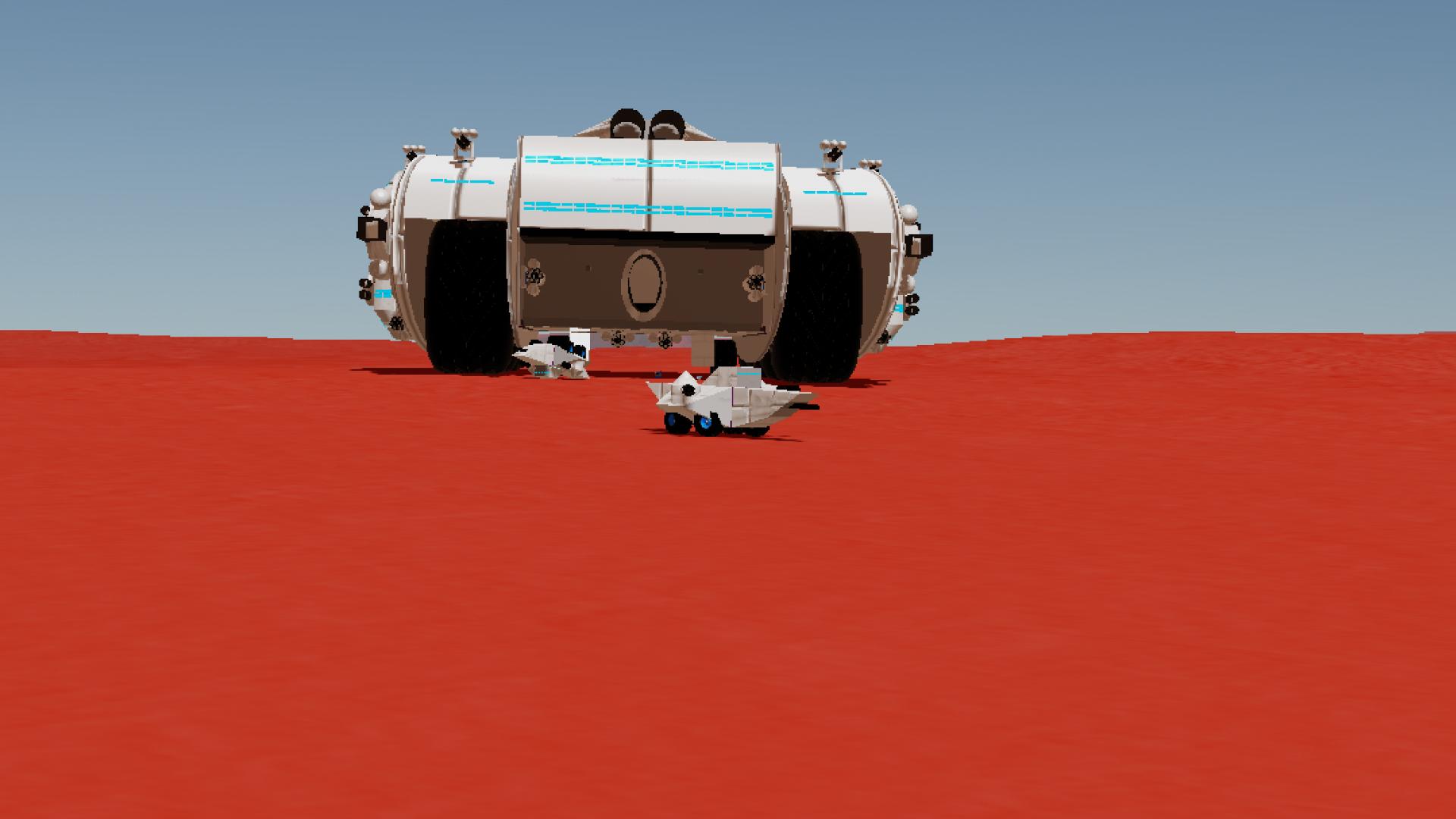 The Enidor Class Heavy Landship is the largest land vehicle that roams the surface of Nennekor, meant to conquer territory for the Red Imperium, due to its capabilities to level cities, maul outposts, destroy military bases, take on platoons, mow infantry, bring down aircraft and run over light vehicles (it is capable of doing that in lore thanks to its chunky wheels). This landship also serves as a mobile base and is able to intercept hostile siege armies mid route...often emerging victorious thanks to its vast armament and capacities, this landship hosts 4 dual barrelled side mounted medium plasma turrets, 4 Large side mounted heavy uni barreled long range plasma railguns, 8 anti infantry plasma gatling turrets, 6 quad barrelled anti aircraft plasma turrets, 1 superheavy City killer dual barrelled railgun turret, 1 heavy intergrated plasma railgun and 2 chisel class surface-space (also used as a city killer) missile nests (9 missiles a nest), this armament alone does make it capable of destroying many structures and vehicles of various sizes, even space warships in orbit. This landship also hosts several troop chambers (2 chambers in the wheelrooms and 1 large chamber above the hanger and below the control room) and various armouries to support prolonged troop stays and to conduct many operation, these chambers combined can sport ±100 soldiers and tank crew for the 2 tanks within the hanger. These tanks are Senitalas class anti infantry tanks, sporting 2 plasma gatling turrets and 1 intergrated medium plasma vehicular combat cannon. Tips for tank deployment: please, firstly open the cargo bay, then put the warp in slow motion (about 1/19th) and just let them fall to the ground...if you put warp speed back to normal...the tanks will hit the ground and bounce randomly and cause mayhem...not abiding by physics (if they did they'd not bounce as if they saw a flying cockroach...).