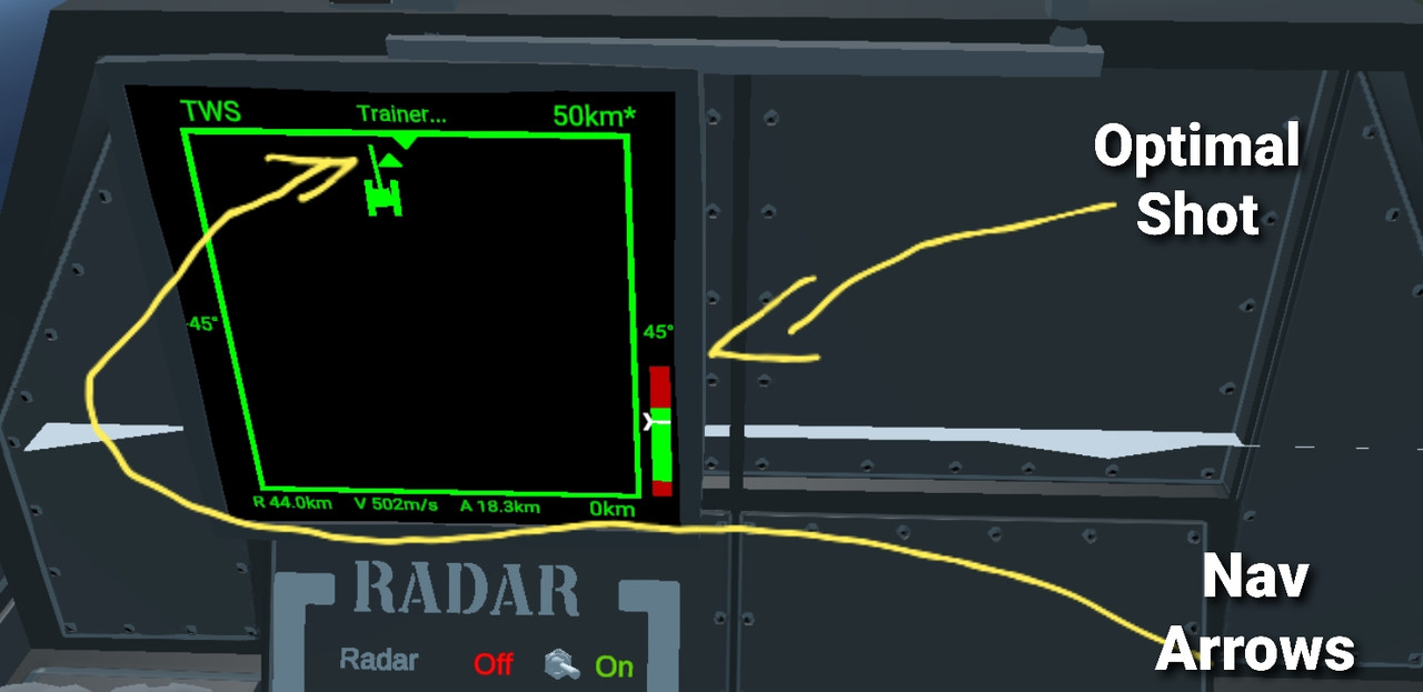 also includes a navigation aid where a path to selected target is indicated by two up down arrows, align the arrows for correct horizontal navigation towards selected target ( includes lead calculations for moving target to make interception flights easier).